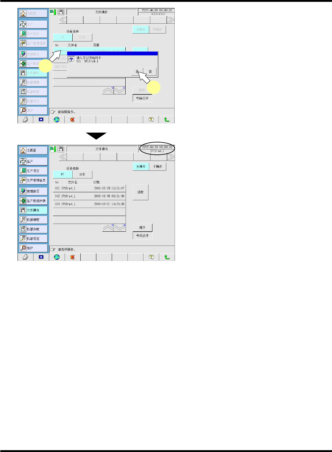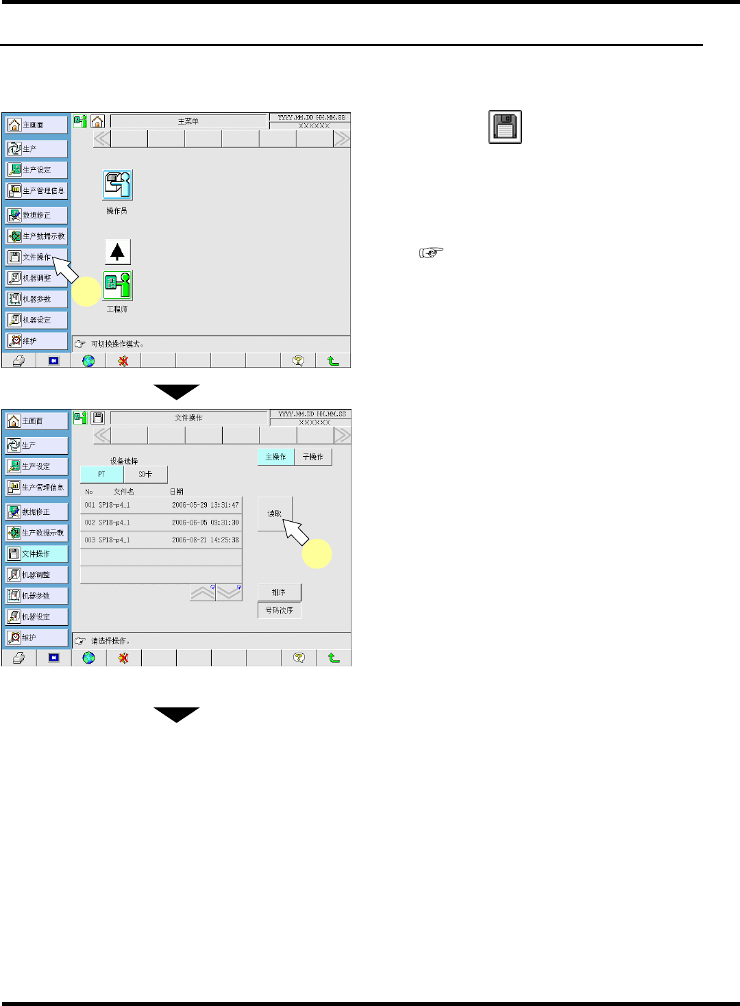 SP18P-L 程序手册 2.1 PT 文件操作 Page 2-2 2. 2.1 PT 文件操作 进行在 PT 内编制而成的生 产数据的读取操作。 ∗ 设备中存储的数据被删 除。请在保存数据以后再读 取。 1. 按主菜单的 。 • 将显示 < 文件操作 > 的画面。 • 在 PT 上将显示列表登录的 数据。 ∗ 需要在 PT 上列表登录。 ( PT 程序手册 (PT 工具 ) 。 ) 2. 按 [ 读取 ] 。 下一页 EJ…