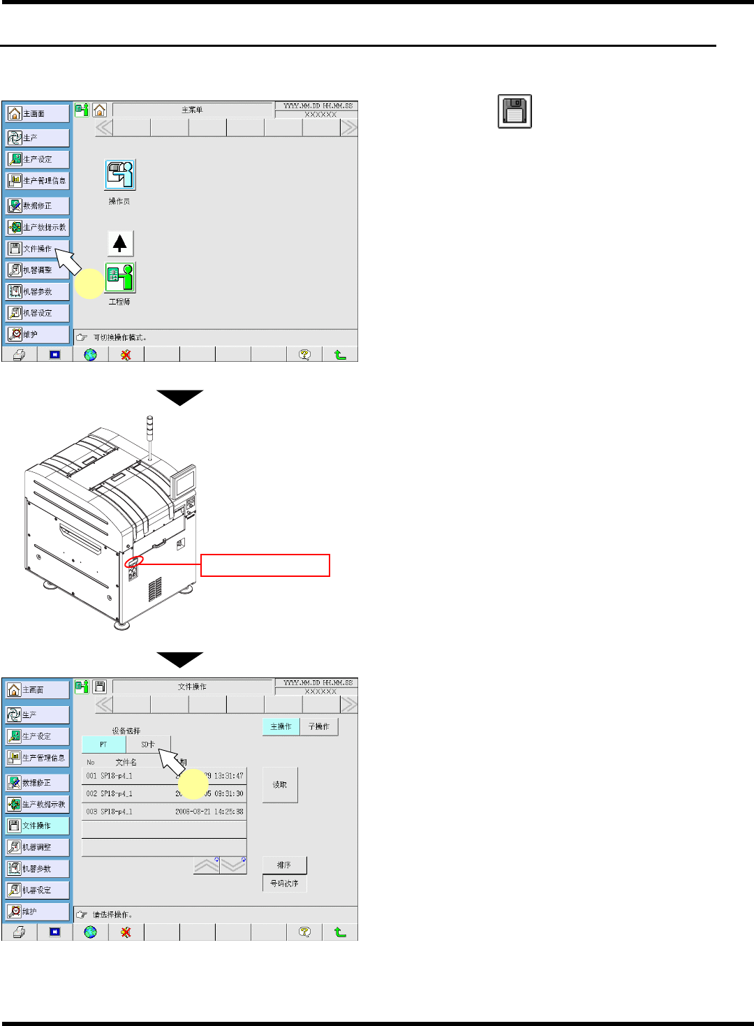 SP18P-L 程序手册 2.1 PT 文件操作 Page 2-3 3. 选择读取数据名。 • 将反转显示选择的数据 名。 4. 按 [ 是 ] 。 • 将显示 “ 读取中 ” 的信息,读取数据。 ∗ 中止数据的读取操作时 ,请按 [ 否 ] 。 • 如果读取结束,将显示 左侧的画面,并在右上 角显示文件名。 EJP1A- C-PMA02-A0 1-01 EJP1A-Fm -0023 3 4 EJP1A-Fm -0024