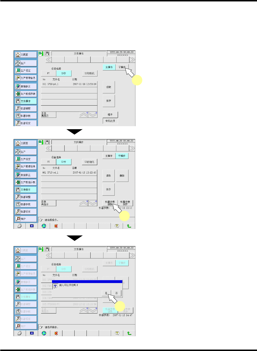 SP18P-L 程序手册 2.2 SD 卡的文件操作 Page 2-9 2.2.4 机器参数的读取 / 保存 在本节中对机器参数的 读取或保存进行了说明。 读取时 把 SD 卡中的机器参数 读取到装置的内存。 1. 按 [ 子操作 ] 。 • 将显示 < 文件操作 > 画面。 2. 把机器参数用 SD 卡插入 SD 卡读取器内。 3. 按 [ 机器参数读取 ] 。 4. 按 [ 是 ] 。 • 将显示 “ 读取中… ” …
