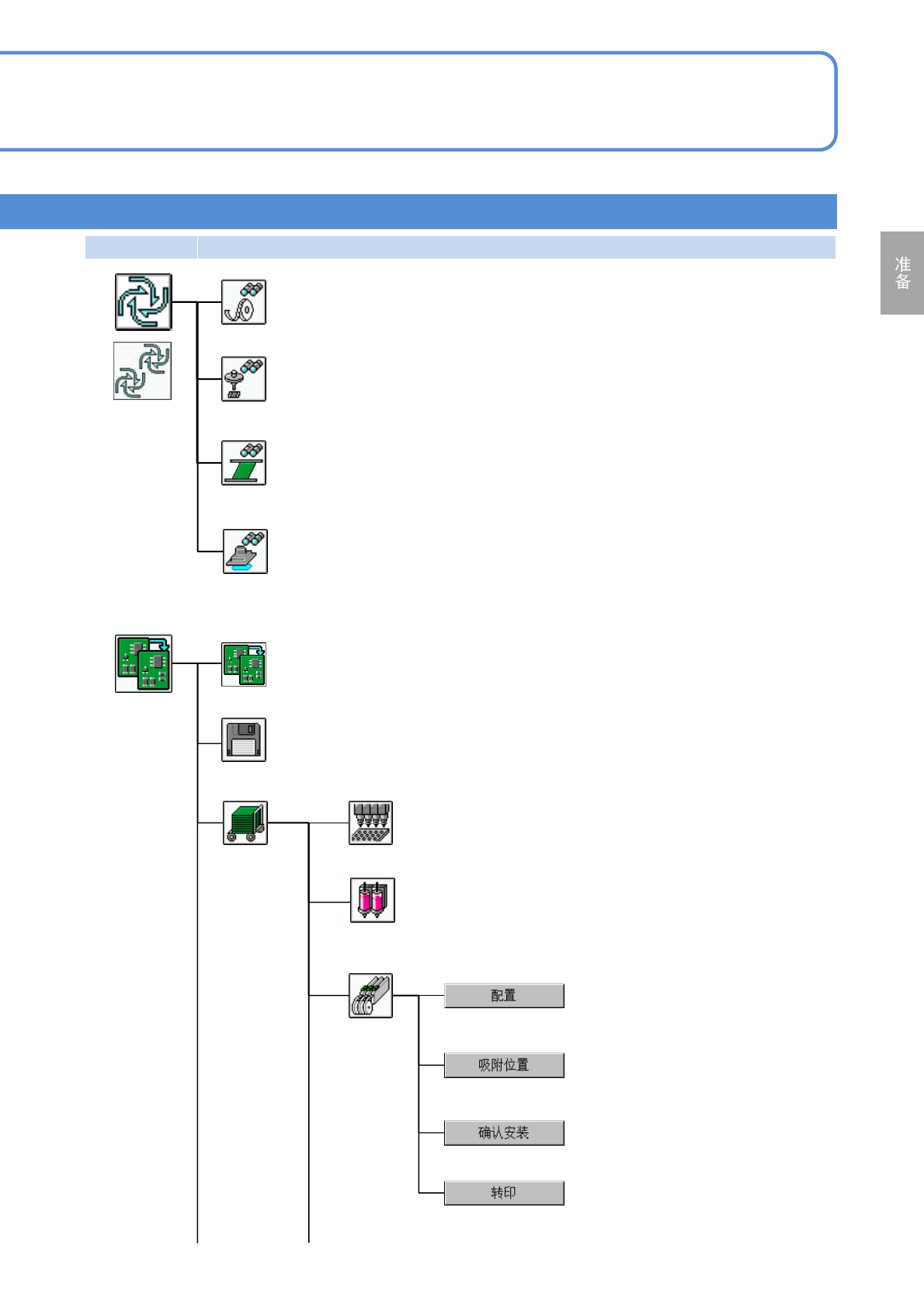 NPM-D3 EJM6DC-MB-02O-09 第 1 阶层 第 2 阶层 第 3 阶层 第 4 阶层 2-2-2 -7 菜单构成 4 工程师模式 2 确认托盘状态。 托盘 用颜色来显示生产数据和托盘状态。 根据各供料器地址来确认生产中的吸 着位置学习后的补正值。 准备菜单 准备零部件 传送带 进行基板支撑销单元的更换动作。 显示基板位置,从各位置进行传送。 调整轨道宽度。 事先计算生产计划所需的元件消耗量 。 生产计划 显示各基台的运…