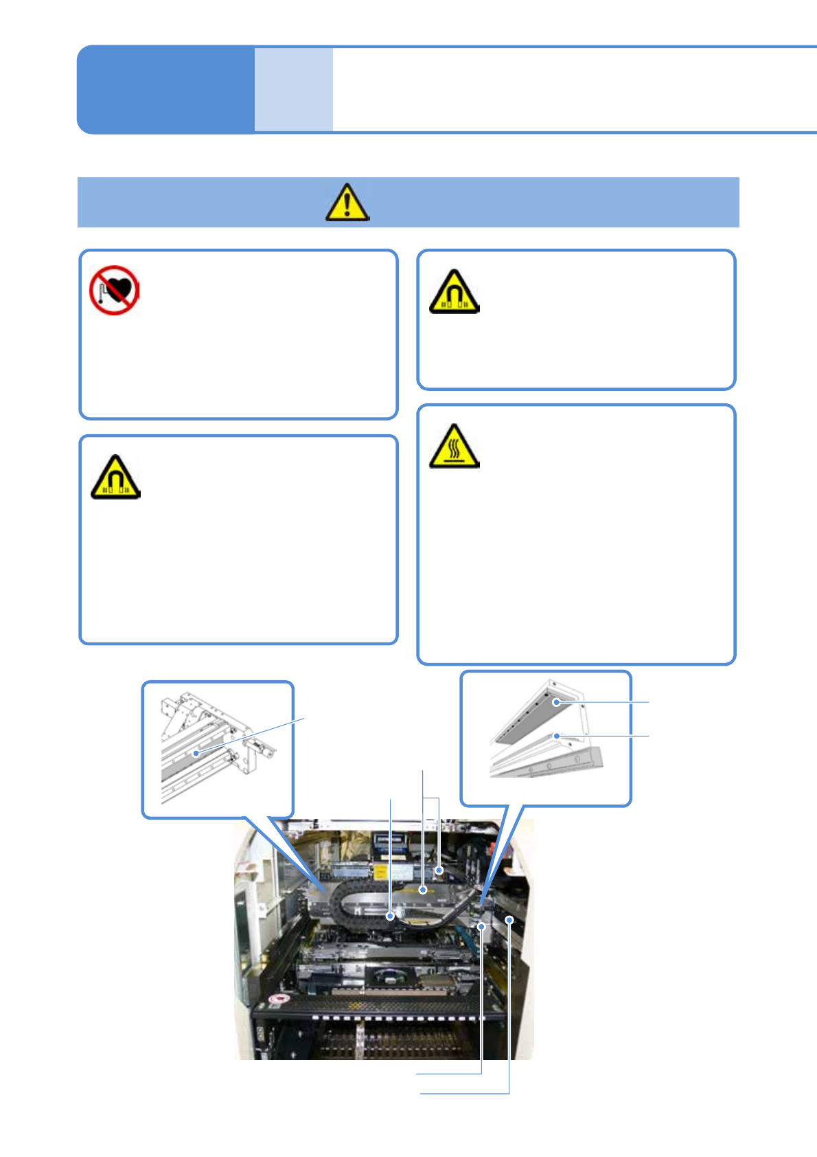 NPM-D3 EJM6DC-SF-01N-0 9 1-1 -5 使用心脏起搏器的人 员请勿靠近直线马达 ( 可能受伤 ) 请勿拆开直线马达 ( 定子:磁石的强大吸着力,可能受伤 ) 请勿碰触直线马达的 转子 ( 可能烫伤 ) ●转子处于高温状态 ( 在 25 ℃ 环境下有 80 ℃ 、在 35 ℃ 环境下有 90 ℃ ) 。 ●即使运转停止后,下降到室温也可 能 需要 3 小时以上。 进行作业时请勿戴金 属类物品或者靠近金 属类物品 (…