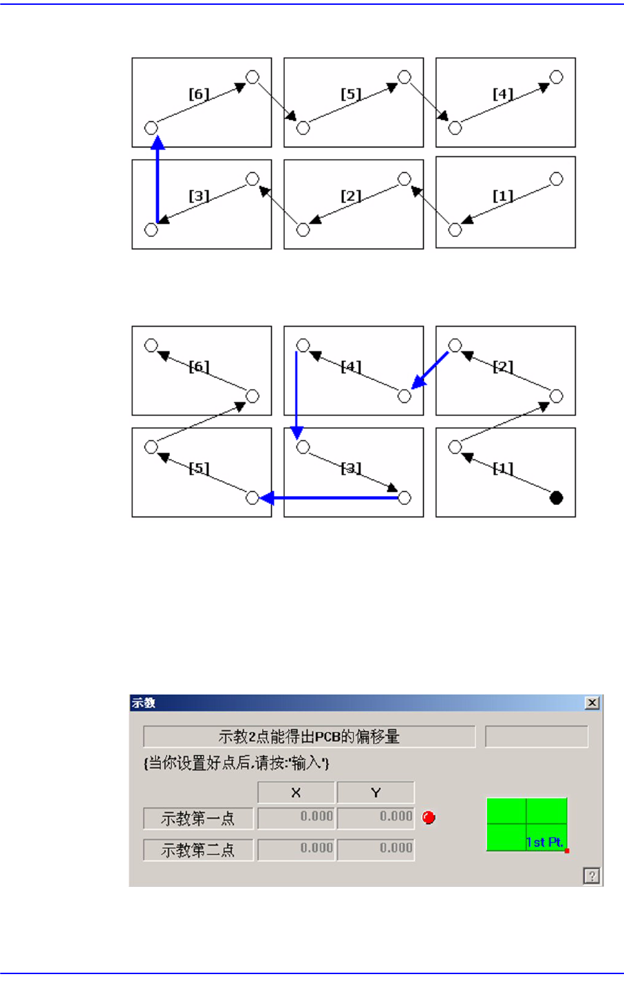 6-13 Board 定义 < 通过点 > 选项按钮 它是一个周期内完成多片 PCB 的所有单片 的作业后, 再进行下一个周期的 方式。 <4. 设置拼板 ( 规则 类型 )> 领域 进行多片 PCB 的初始化。 此功能在多片 PCB 为常规的排列方式时, 自动设定各 单片的偏移量。 < 数量 > 编辑框领域 输入多片 PCB 的排列片数。 < 计数方向 > 选项按钮领域 …