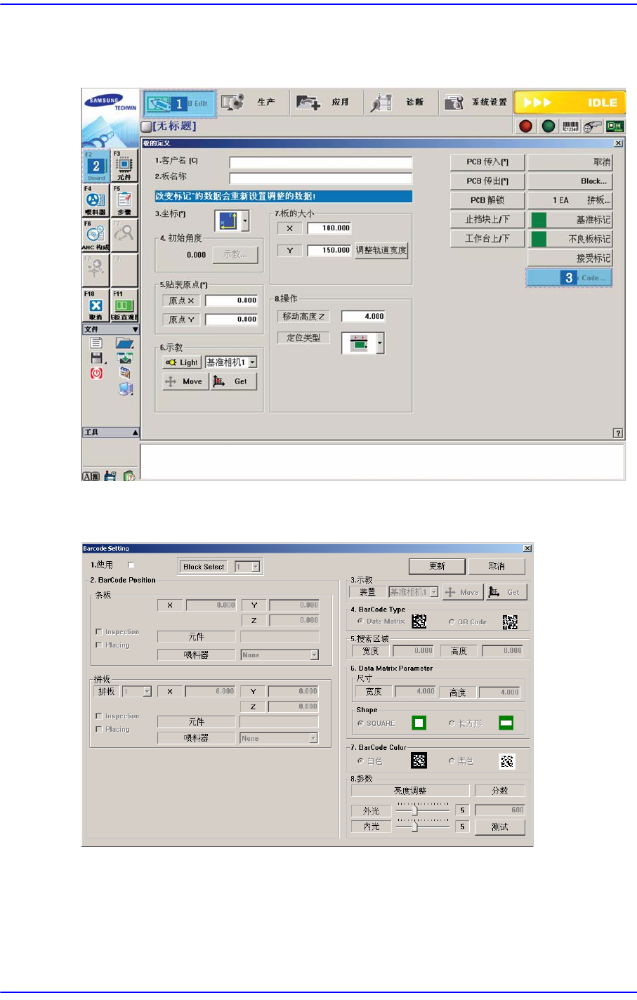6-35 Board 定义 6.6. 2D Barcode 6.6.1. 环境设置 本功能是可以与 L TS(Lot T racking System) 联动使 用的选项功能, 使用 Barcode 识别 贴装在 FeederBase 的 Feeder 的功能。 2D Barcode 使用时 ”C:\SmartSM\bin\SmartSM.ini” 文件的 [Option] 项目中设置成 IQFEEDER=1, LotT racki…