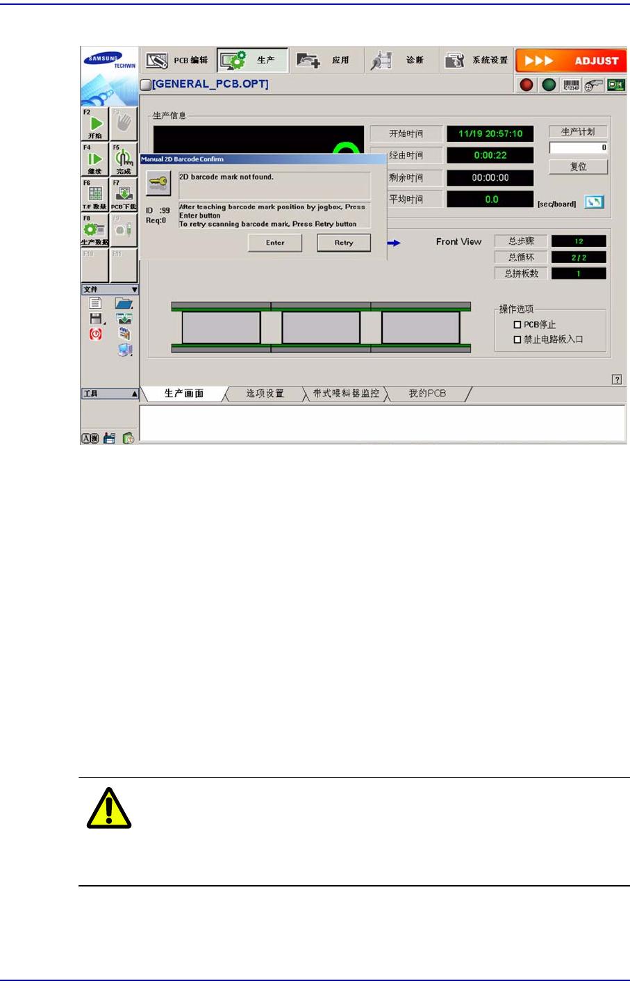 6-42 Samsung Component Place r SM481 Administrator's Guide 警 告 设备 Ready 状态下如果手动除去 board 或采取故障措施可 能会 受到伤害。 请务必开 窗解除 Ready 后设备 IDLE 状态下手动除去 board 或采取故障 措施。