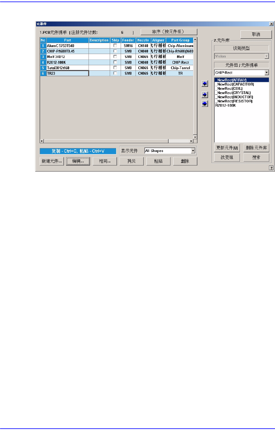 7-2 Samsung Component Place r SM481 Administrator's Guide 图 7.2 “ 元器件 ” 对话框 <1. PCB 元件清单 > 领域 显示现在已经登记的部品清单 。 <Part> 列 显示部品的名称。 <Feeder> 列 表示供应部品的 Feeder 种类。 <Nozzl e> 列 表示吸着部品的主吸嘴。 吸…