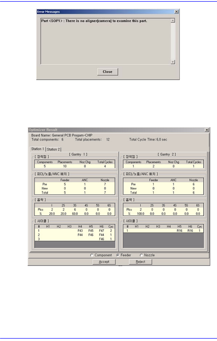 10-11 Optimization 如下给使用者提供情报。 根据使用者的选择继续执行或停止 Optimizer 。 提示类型 2 虽然给使用者提供情报, 但与使用者的输入无关, 经过一定的时间后继续执行 Optimizer 。 <Ignore collisions> 检查框 选择校验框时忽略部件贴装时 已贴装的部件和喷嘴之间可能发 生的碰撞按 照规定的作业顺序贴装部件。 <This window …>…