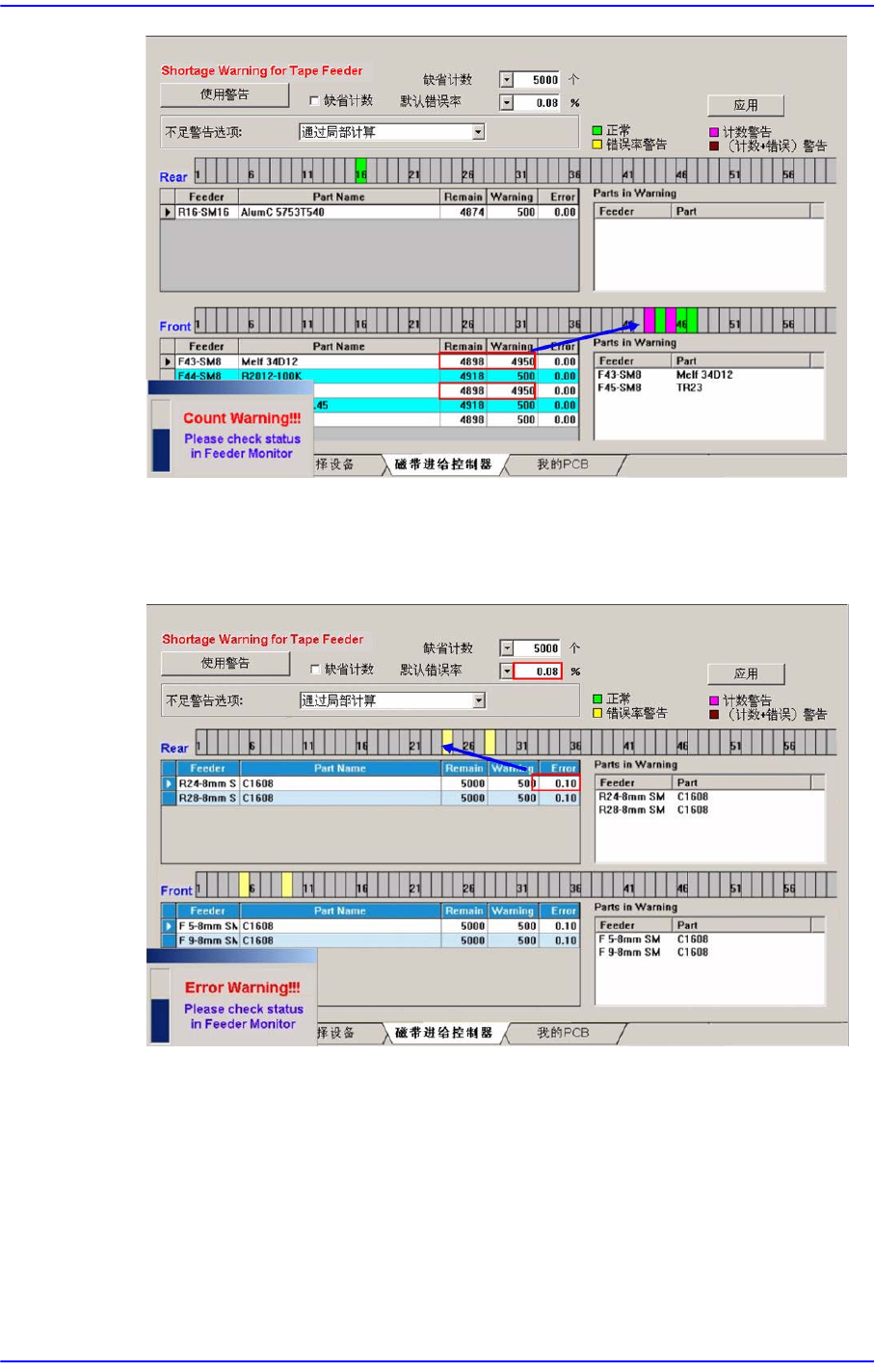 显示已贴装Tape Feeder的部件剩余量,可设置警告部件不足的部件剩余量,监控与