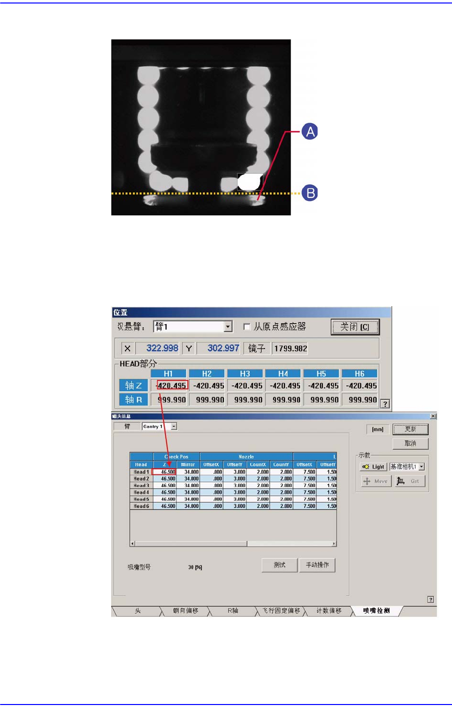 12-15 Machine Calibration Z 轴高度的示教 (Head Z T eaching) 默认值为 50.5 。 1) 在 Vi e w 菜单选择 执行 “ 位置 ” 。 2) 在 Noz zle Check T AP 对话框单 击 < 手动操作 > 键, 执行 “ 手动控 制 ” 对话 框。 3) 在 Axis T AP 对话框的 < 轴 > 组合框选择 Z 。 4) 在 Camera T…