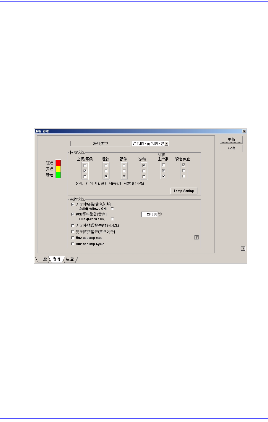 13-21 系统设置 命令时, 显示检查信 息框。 <XY , Z 轴 > 选项按钮 : 选择此按钮时, 向 设备传送移动命令时, 如果是 XY , Z 轴的移动命令时, 显 示检查信息框。 < 更新 > 按钮 把设定的数据传送到设备之后关闭 对话框。 13.5.2. < 信号 > TAP 对话框 设定显示设备的状态的信号台 ( Signal T ower ) 灯的状态。 选择此按钮时显示如下…