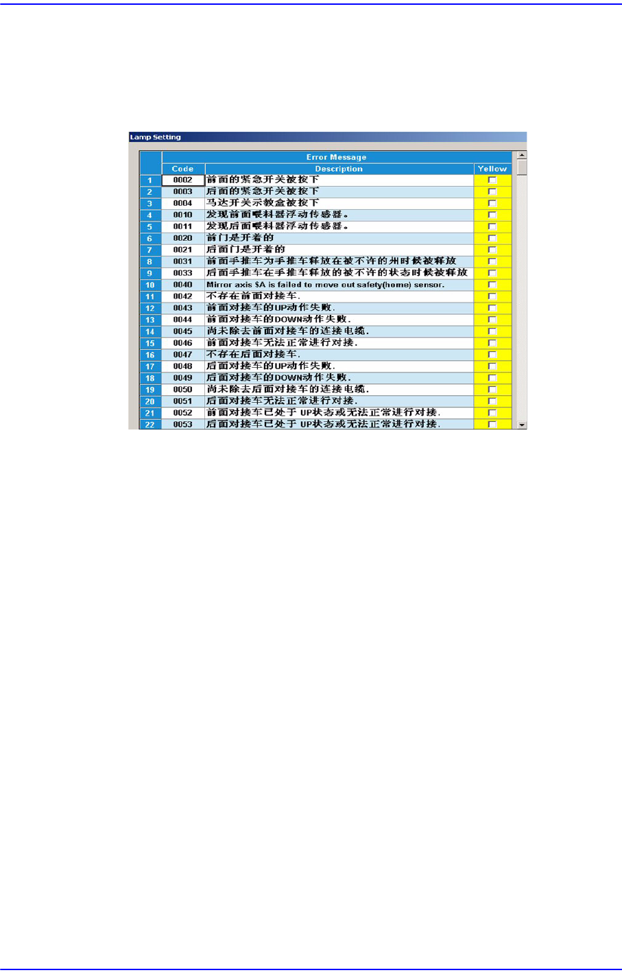 13-23 系统设置 < 更新 > 按钮 把设定的数据传送到设备之后关闭 对话框。 以下是信号灯 Default 设定 相应的设备状态。 黄色灯亮灯时 设备在 IDLE 或 WA I T 状态下处于不进行作业或作业等待状态。 绿色灯亮灯时 设备在 RUN 状态下处于作业状态。 绿色灯灭灯时 设备在 P AUSE 状态下作业中 处于暂停状态。 红色灯亮灯时 设备在 FREEZE 状态 下由于作业中发生故障设…
