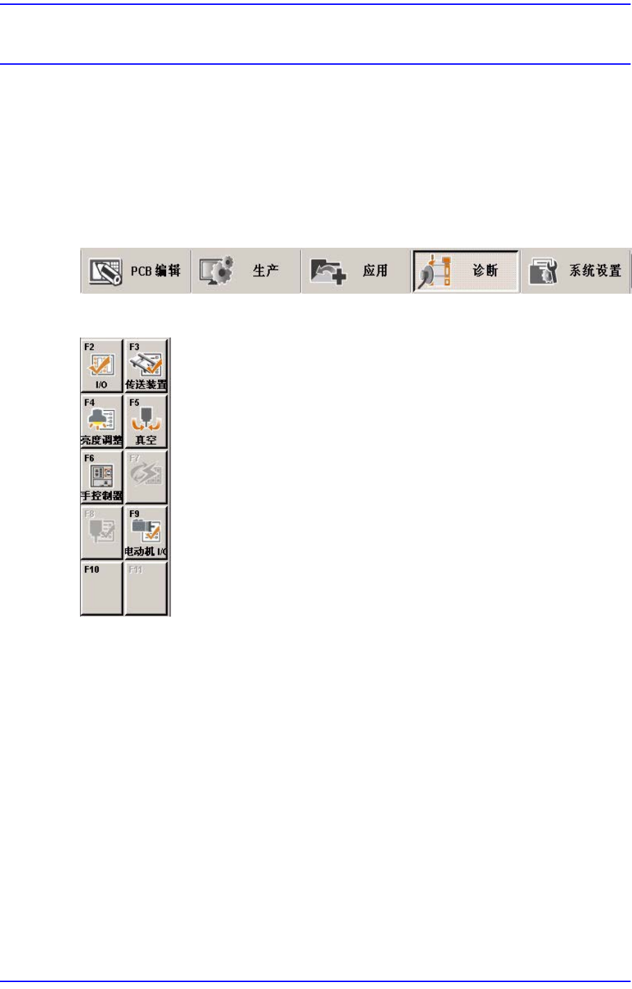 诊断(Diagnosis)菜单由I/O(输入/输出), 传送装置(Conveyor), 灯光(Light), 真