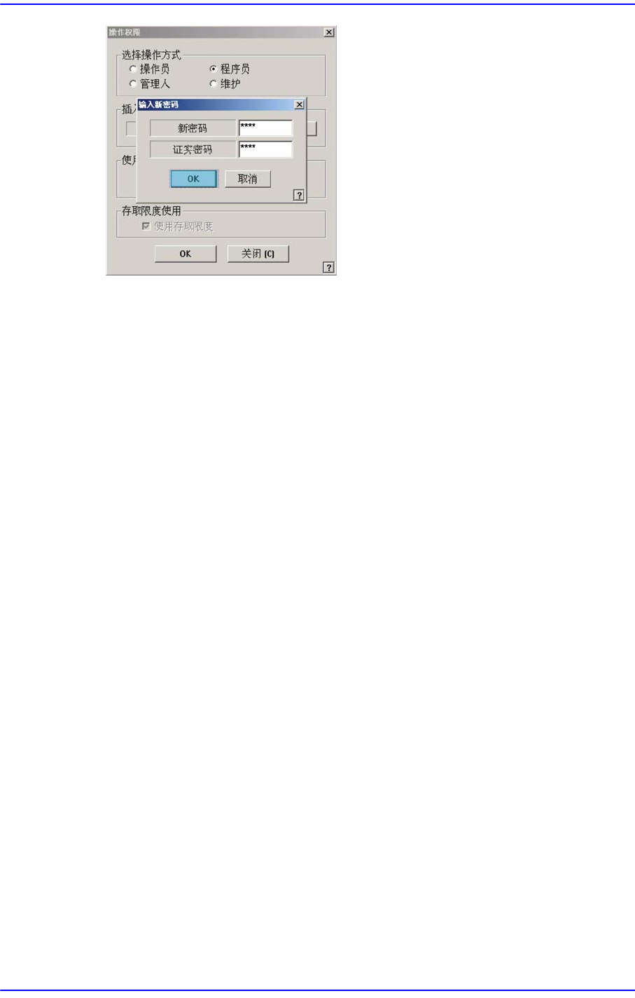 1-11 操作方式及修改密码 1.3. 用户登录时间设定 经过设定的时间后用户权限自动 转换成 Operator 。 设置方法如下。 在 <Authority Limit by time> 领域选择 <Use> 选择框 在编辑框中以分为单位输入 要设置的时间 点击 <OK> 按钮 设置好时间以后截止到权限变更 剩余的时间显示在 MMI 左侧的 To o l s 快捷菜单的下 端。