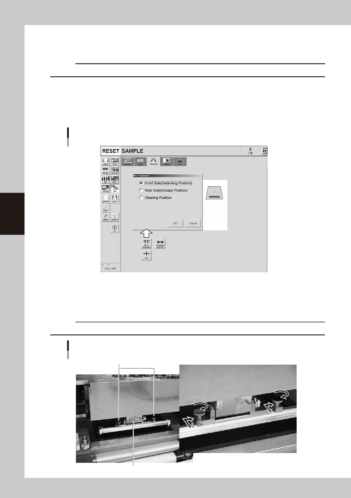 1. After closing the upper door and canceling emergency stop, press the [Move Squeegee] button.