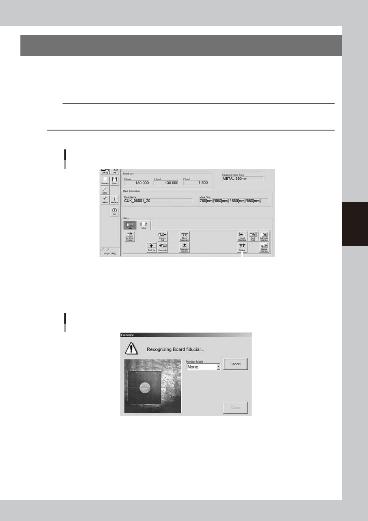 4-22 4 Daily operation 3 Check that the "Rolling" screen appears. After mark recognition is complete, the mark recognition scr een automatically closes. The conveyor table then moves to the printing position an…