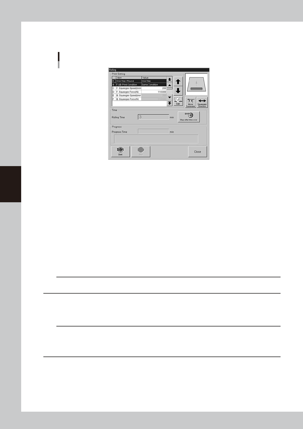squeegee head to the escape position (inward position). Use the [Squeegee Direction] button if needed