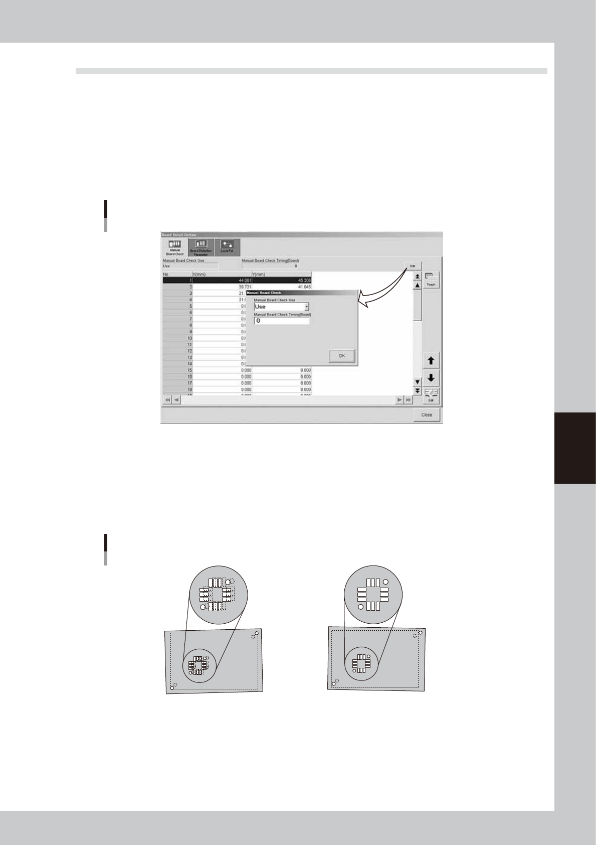 upper right opens the "Manual Board Check" screen. Set whether to use this function or not, as well as the board interval