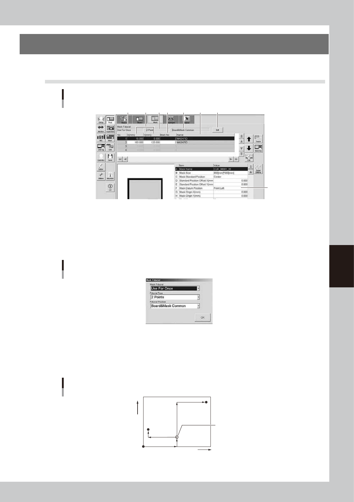 5-16 5 Cr eating and setting the data 3: Fiducial Position T his parameter sets whether to share the fiducial mark position with the board and the mask. Pressing the [Edit] button at the upper right displays the screen s…
