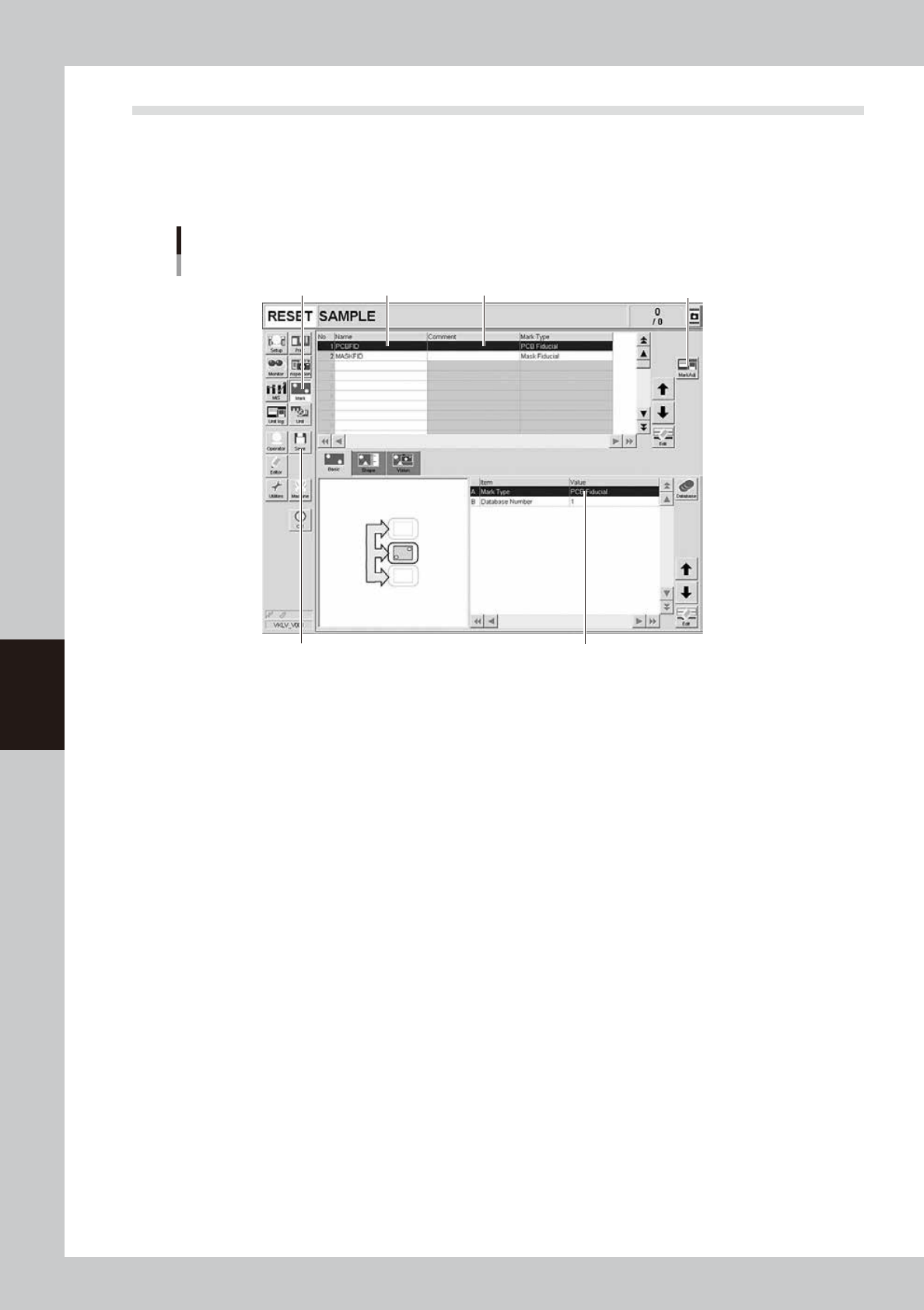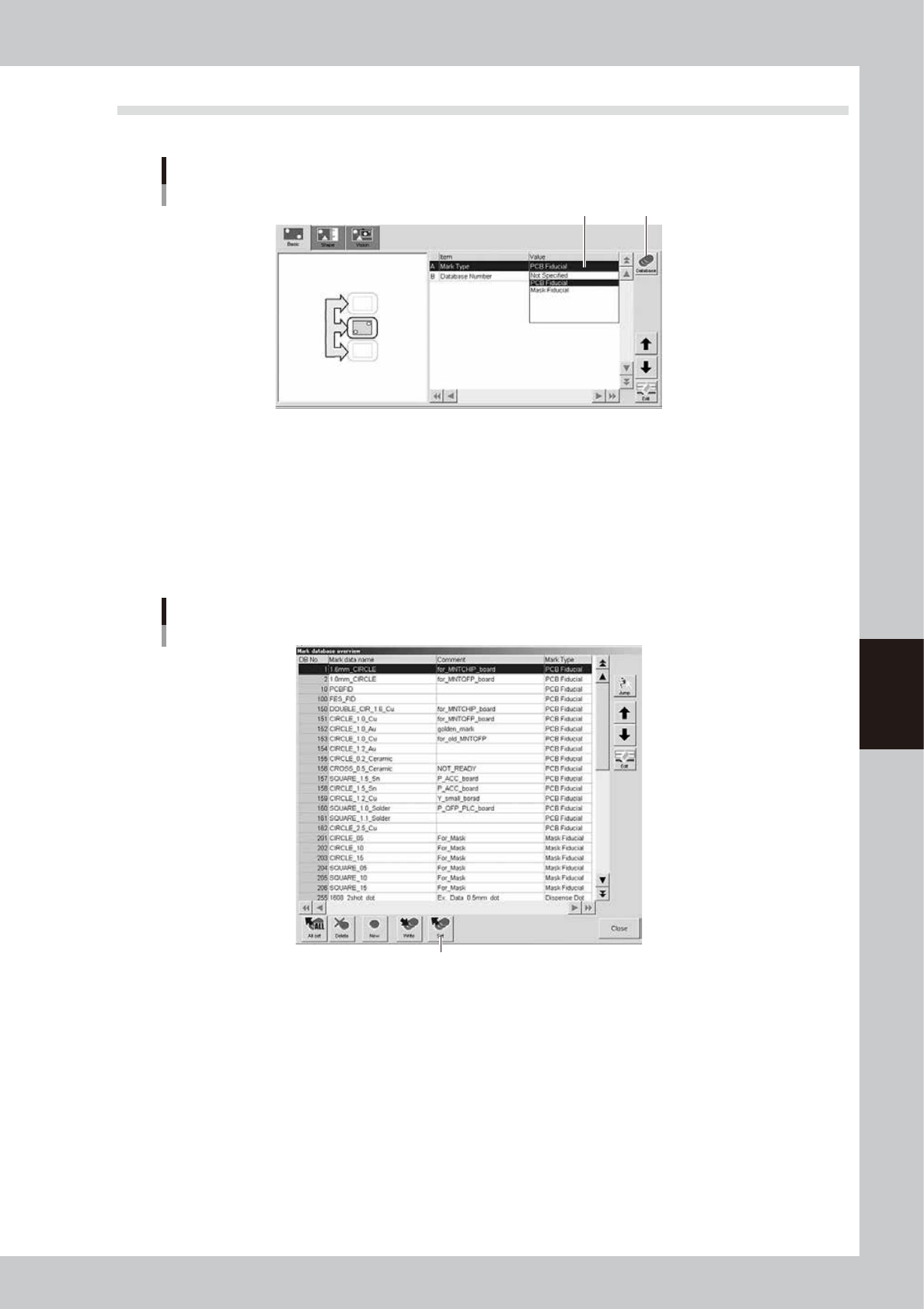 5-35 5 Cr eating and setting the data 7.2 Basic parameters In the list on the [Basic] tab, set the "Mark T ype" parameter . Basic parameters 1 2 64530-N1-00 1. Mark T ype Select the mark type from the drop-down…