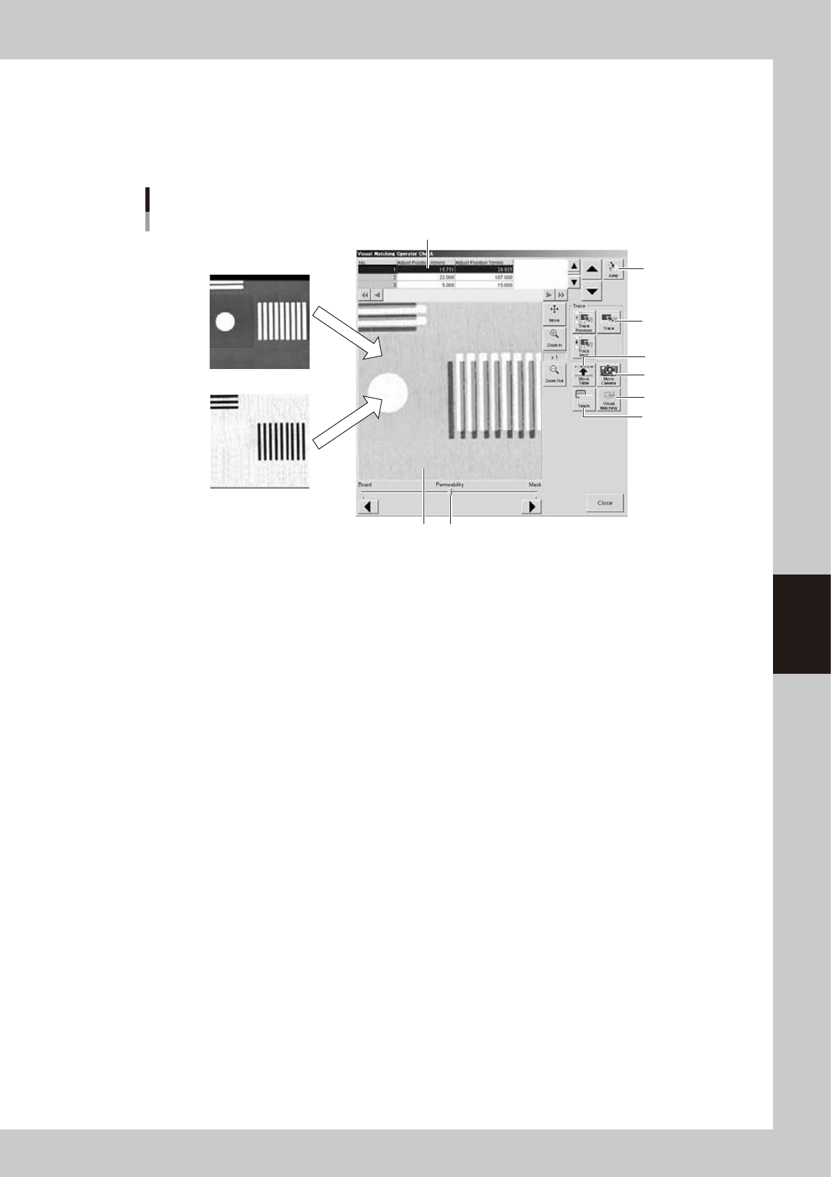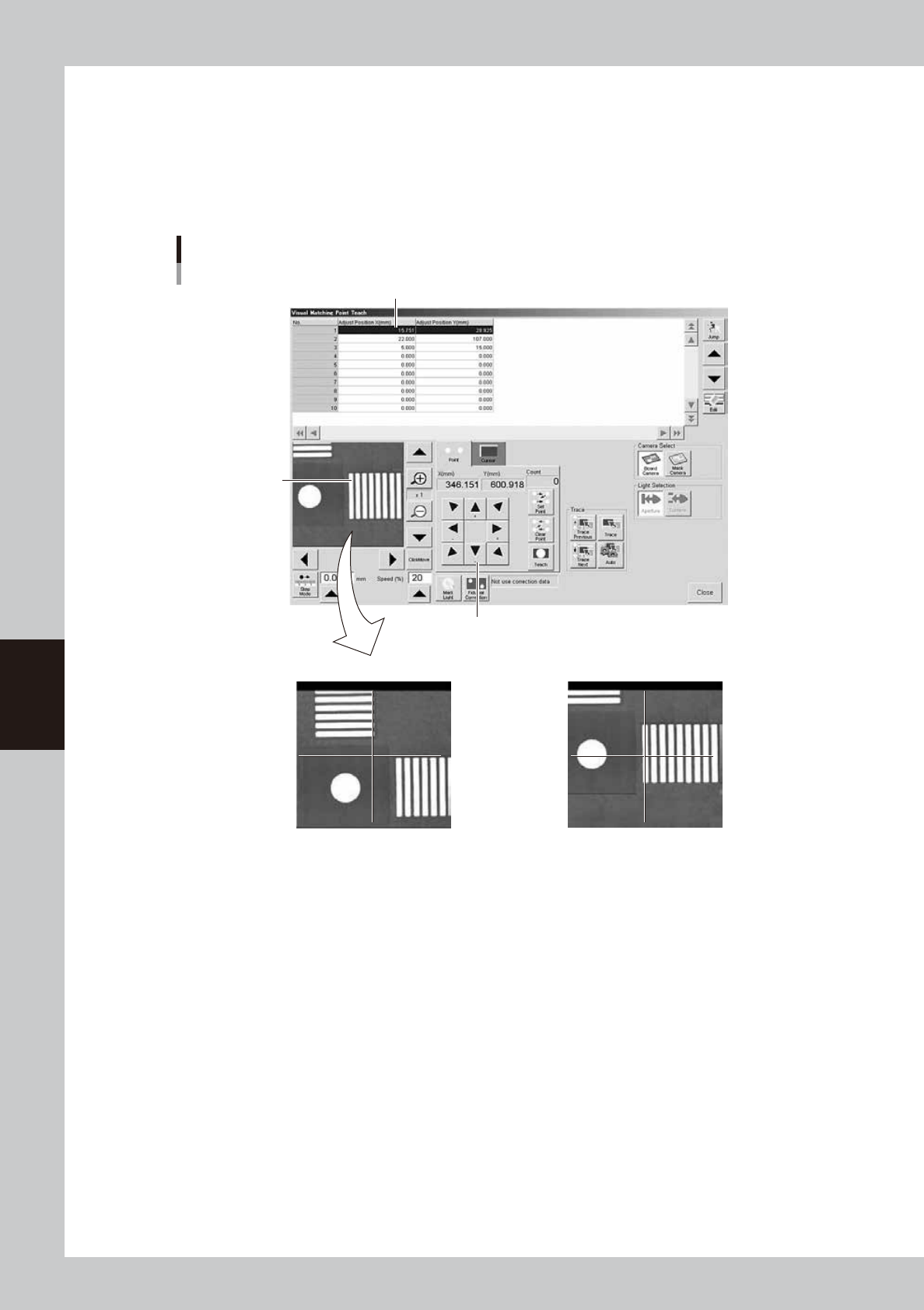 Pressing the [Trace] button displays an image of the currently selected alignment coordinates. Pressing the [Trace
