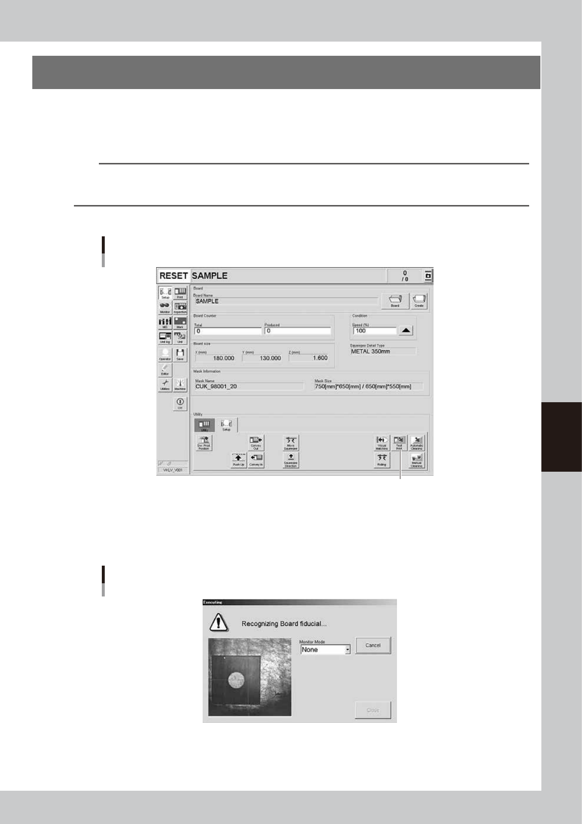 When you are going to make visual check of the test print state on the operation display, leave the board clamped