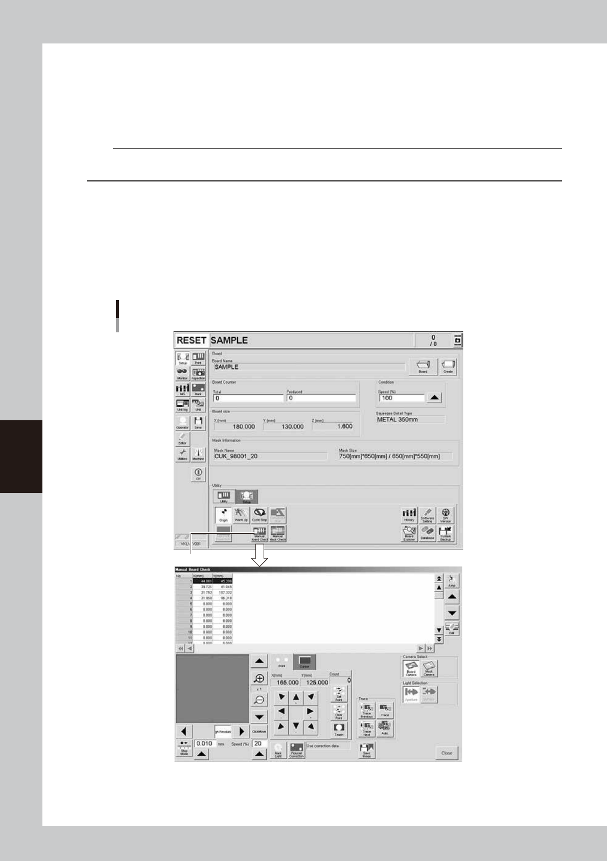 1. Open the [Utility] tab on the Setup screen and press the [Manual Board Check] button.