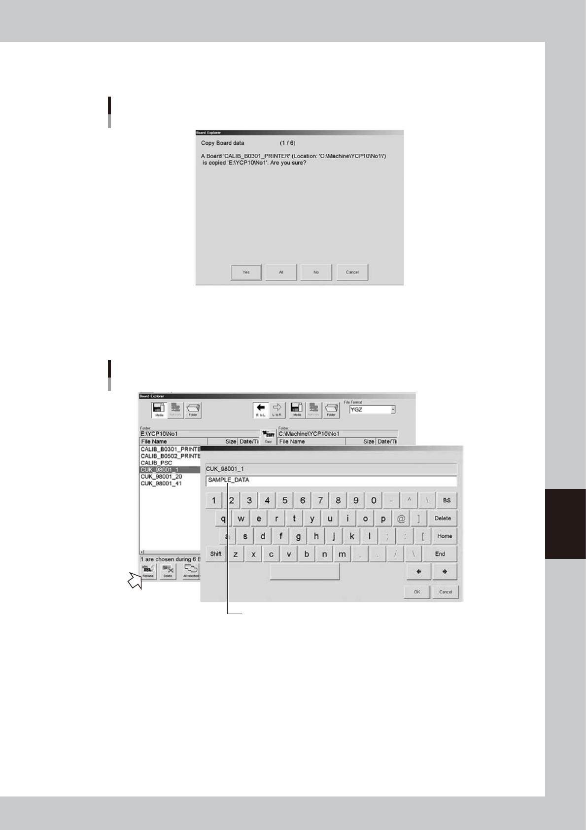 6-5 6 Managing the data 9 Pr ess the [C opy] button. A confirmation screen appears. Press the [Y es] or [All] button to make a copy to the USB flash drive. Copy confirmation screen 64606-N1-00 0 Rename the board data as …