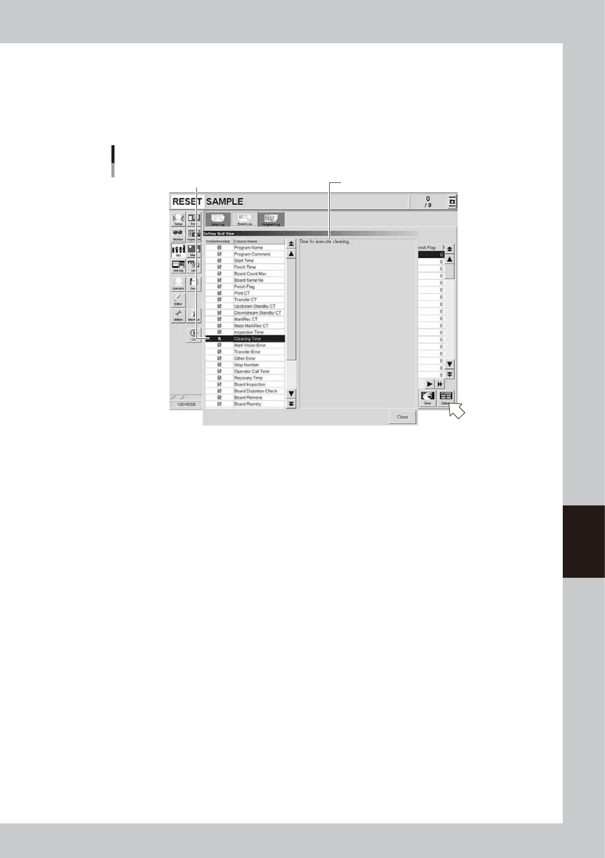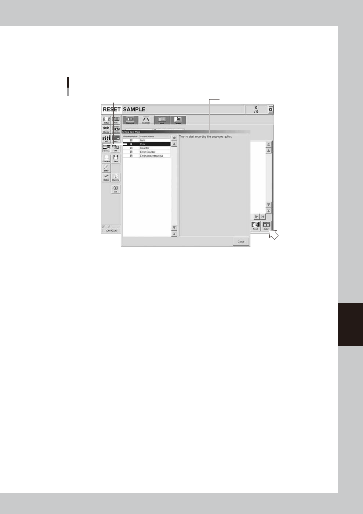 right of the "Unit Log" screen. Pressing the [Option] button opens the "Setting Grid View" screen as shown below.
