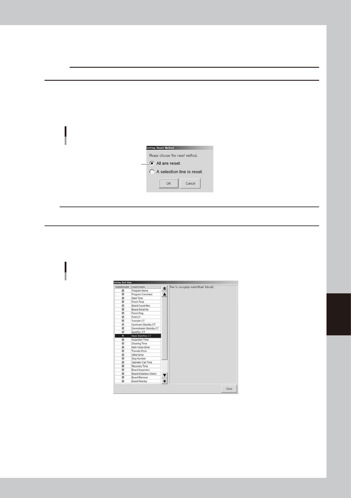 Pressing the [Option] button opens the "Setting Grid View" screen that allows you to show or hide each log data item.