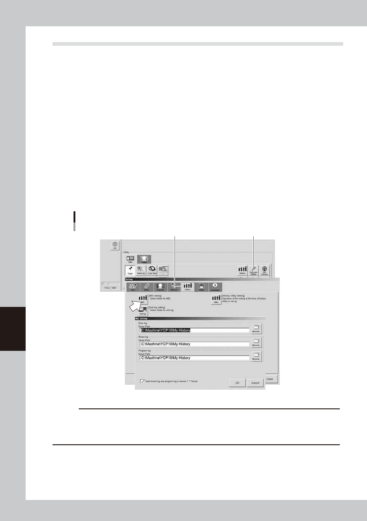 Press the [Software Setting] button or [History] button on the [Setup]-[Utility] tab screen to set the log.