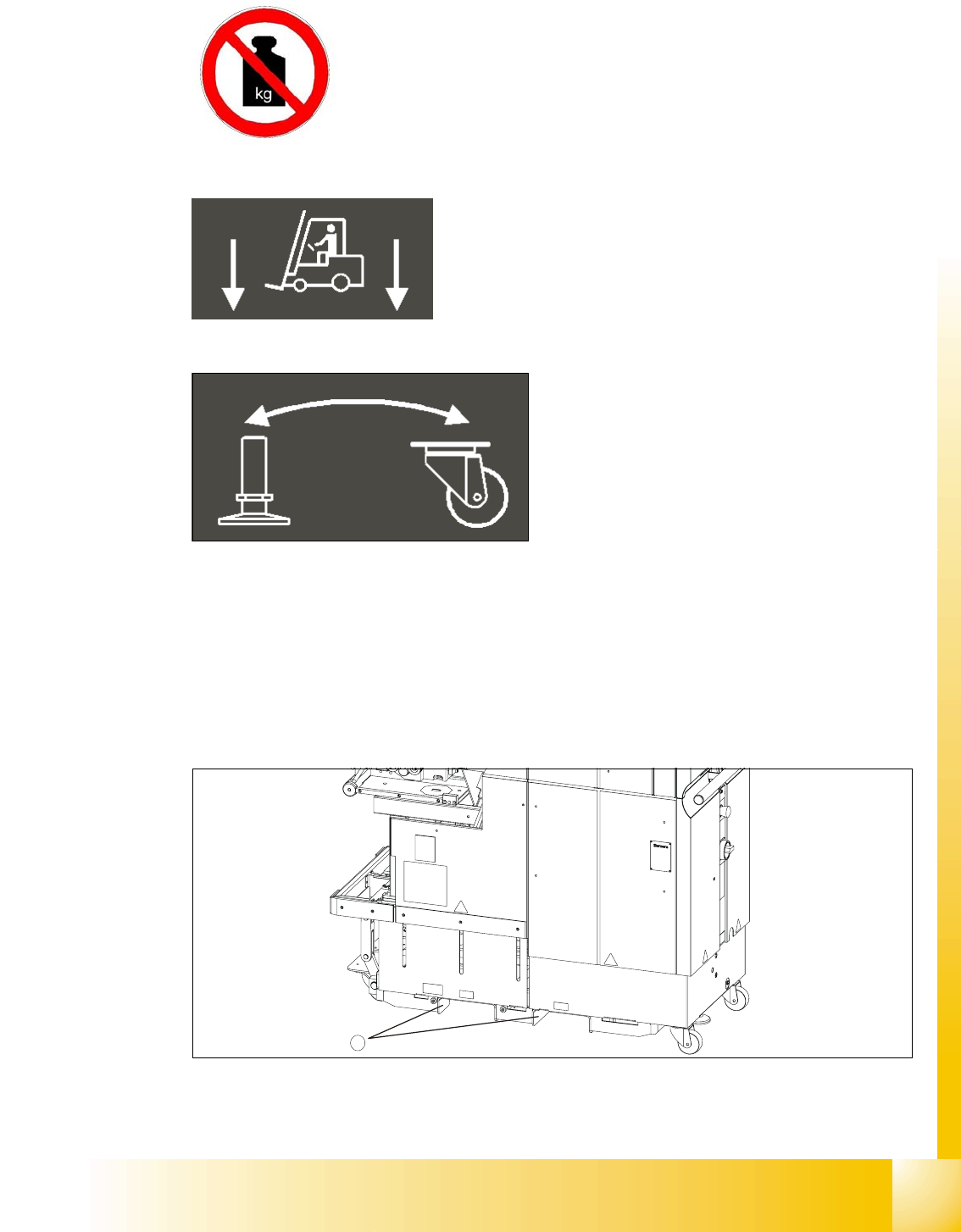 ➠ Größere Transportstrecken dürfen nur mit einem geeigneten Hubwagen oder Gabelstapler zu-