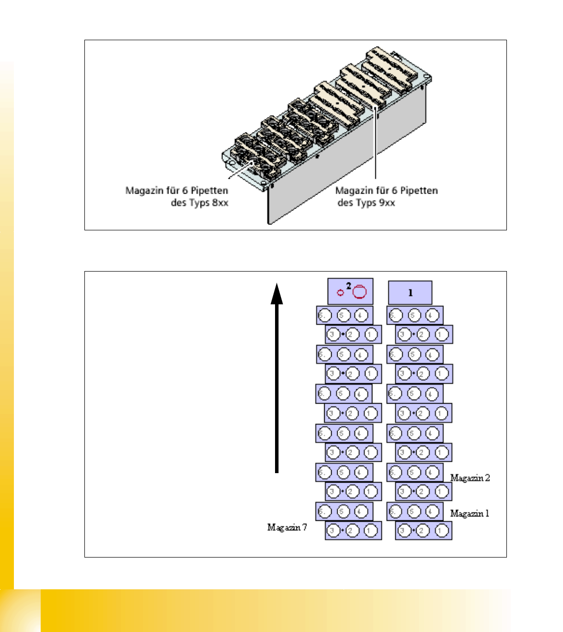 Magazinen, von denen ein jedes über sechs Pipettengaragen verfügt (siehe Abb. 2.2 - 26). Die