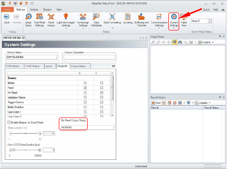 ► Geben Sie im Register "Outputs" unter "No Read Output String" den String "NOREAD" ein.