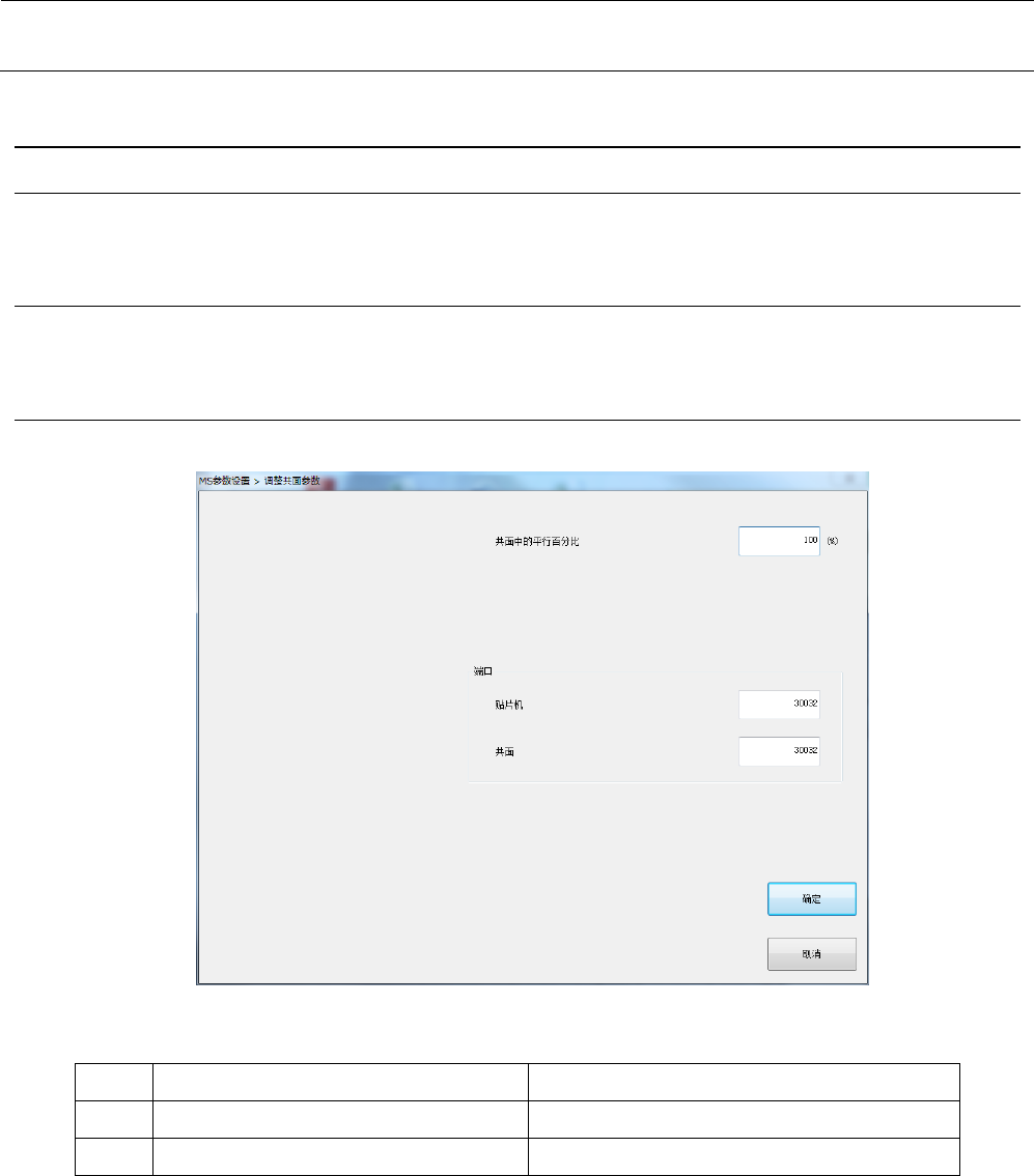 MS 参数 7- 22 7- 11 共面参数 7- 11 -1 功能 设置共线的比例、端 口编号。 7- 11 -2 使用 模具 本项目中不使用模具 。 7- 11 -3 操作 从菜单中选择 “ 单元 参数 ” -“ 调整共面参数 ” 后, 会显示以下对话框。 直接从软件键盘输入 数值。设置项目如 下表。 No. 项目 设置的内容 1 从共面所见的共线 共面中的平行百分比 2 端口编号 端口编号
