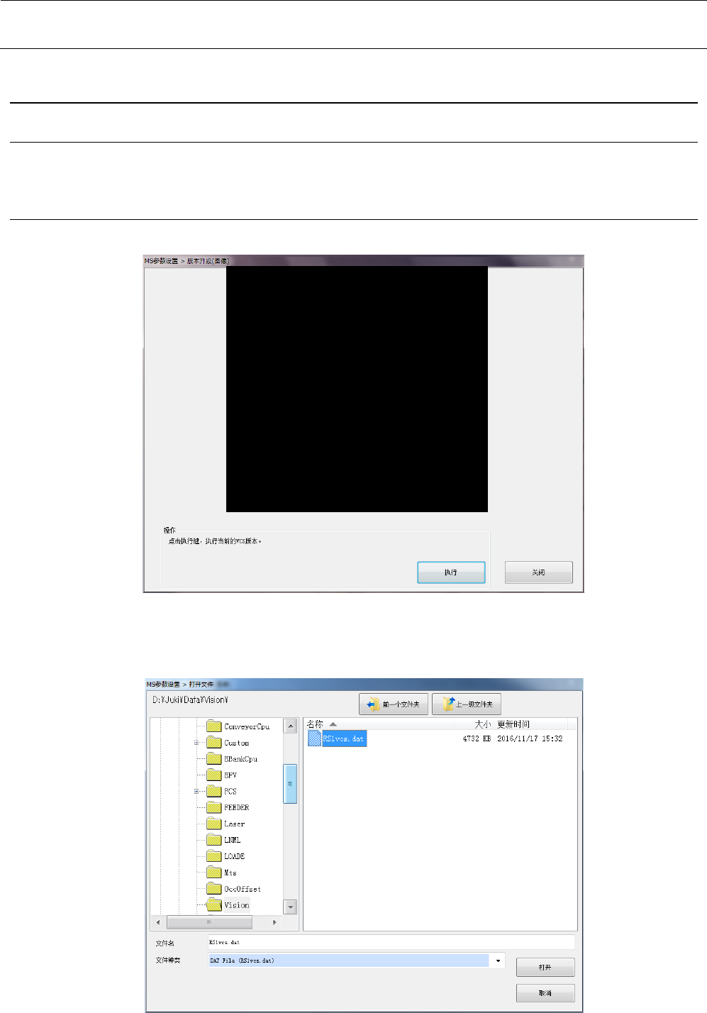 MS 参数 9-1 9 版本升级 9-1 版本升级 - 图像 进行图像固件的版本 升级。 9-1- 1 操作 从菜单中选择“版本 升级”-“版本升 级 - 图像”后, 会显示以下 的对话框 。 按“执行”按钮,打 开用于进行版本升 级的对话框。 (默认位置 : D : \ JUKI \ DAT A \ Vision ) 选择文件 ( R S1 v cs.d at ) ,按“打开 ”按钮, 读入文件 , 向图像装置转送。