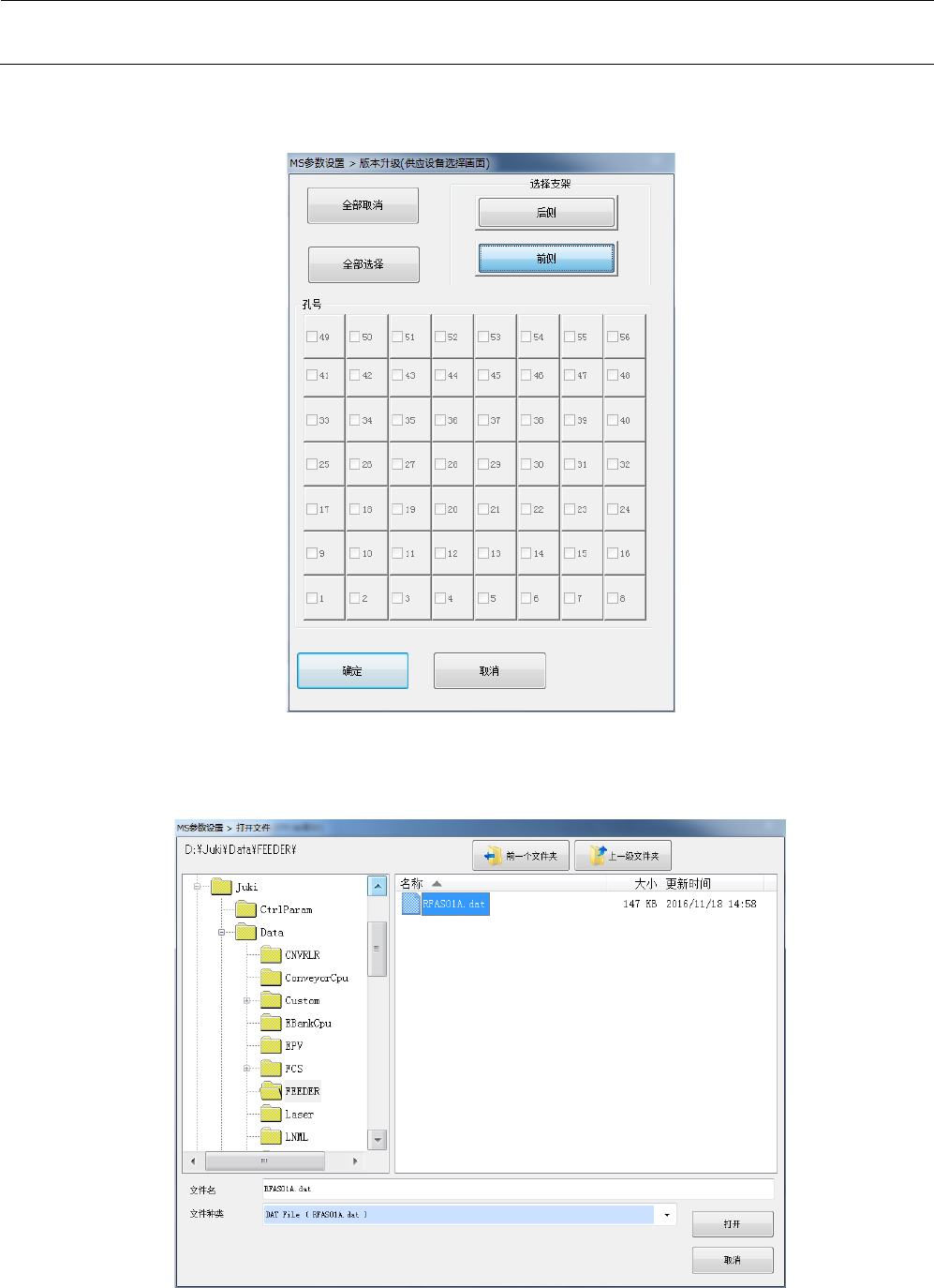 MS 参数 9-8 <指定发送> 如按下 [ 指定发 送 ] 按钮, 会显示以 下的对话 框。 当基板选择中所指定 的供应装置已经连 接时,供应孔 号为有效状态,可以 选择。 选择要进行版本升级 的孔号,按下“确 定”后,会显 示打开文件的对话框 用以进行 版本升级。 台架 ID 基板不使用孔 号,选择 要升级的 台架。