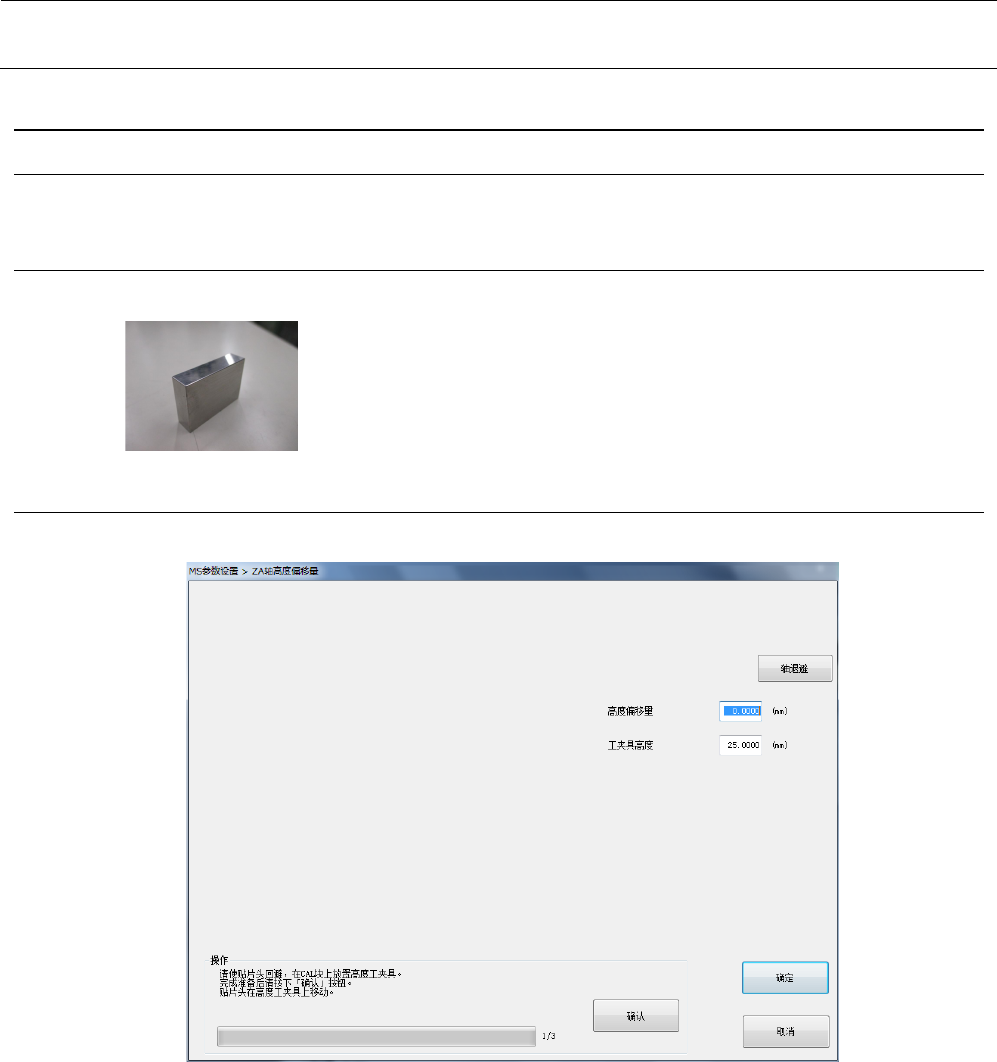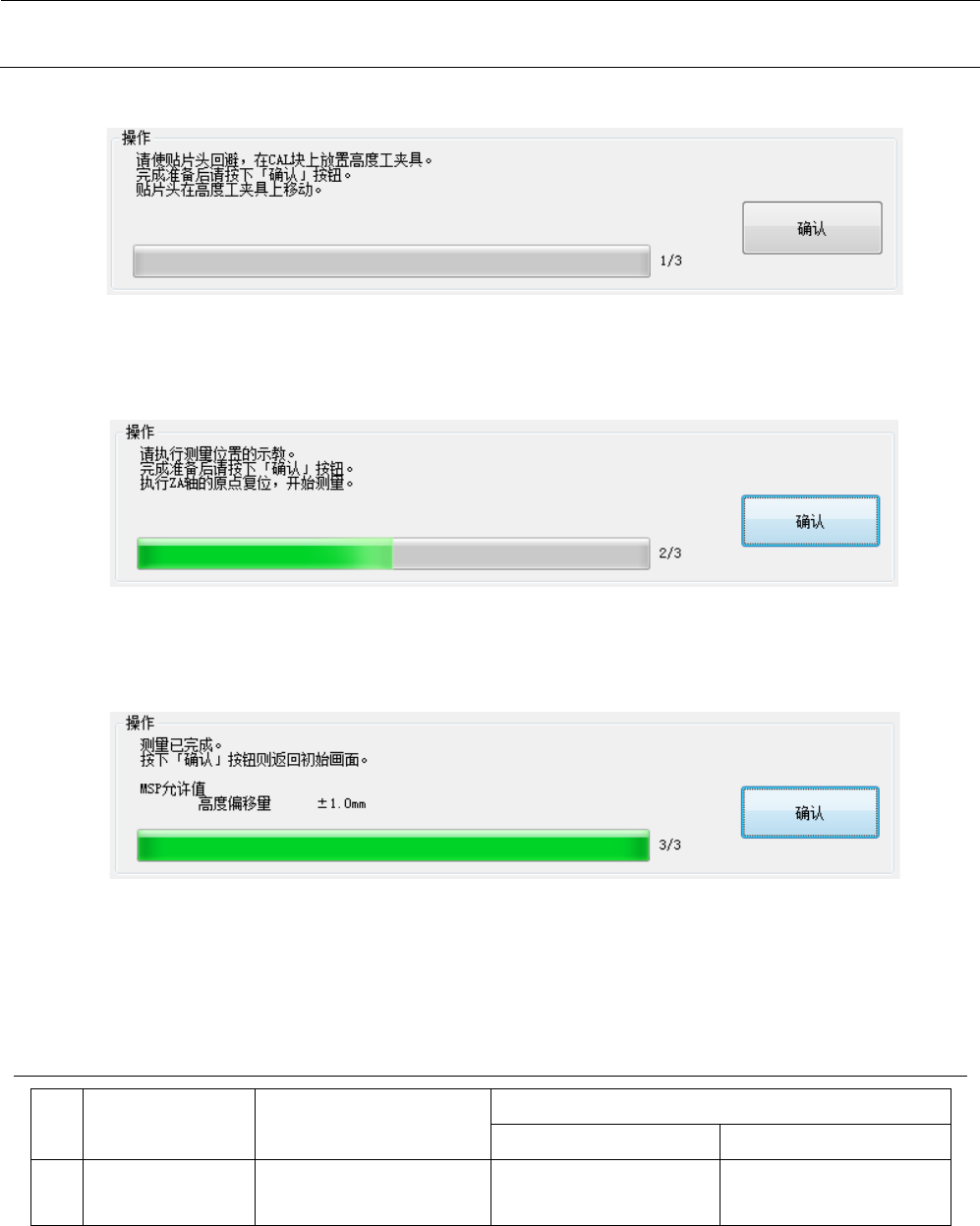 MS 参数 5-3 <操作 ・ 1/ 3 > 请把 ZA 轴 高度 模具安置在校准 块的中心 。 完成准备后,请选择 确认。选择确认后 ,贴装头以 L3 贴装头基准移 动到校准 块上。 <操作 ・ 2/3 > 如测量位置出现偏离 ,请进行测量位置 的示教。 完成准备后,请选择 确认。进行 ZA 轴的原点复归 , 进行 ZA 轴高度偏移量 的获取。 <操作 ・ 3/3 > 设定结束。选择“确 认” ,即返还初始画 面。 请选择贴装头退避,…