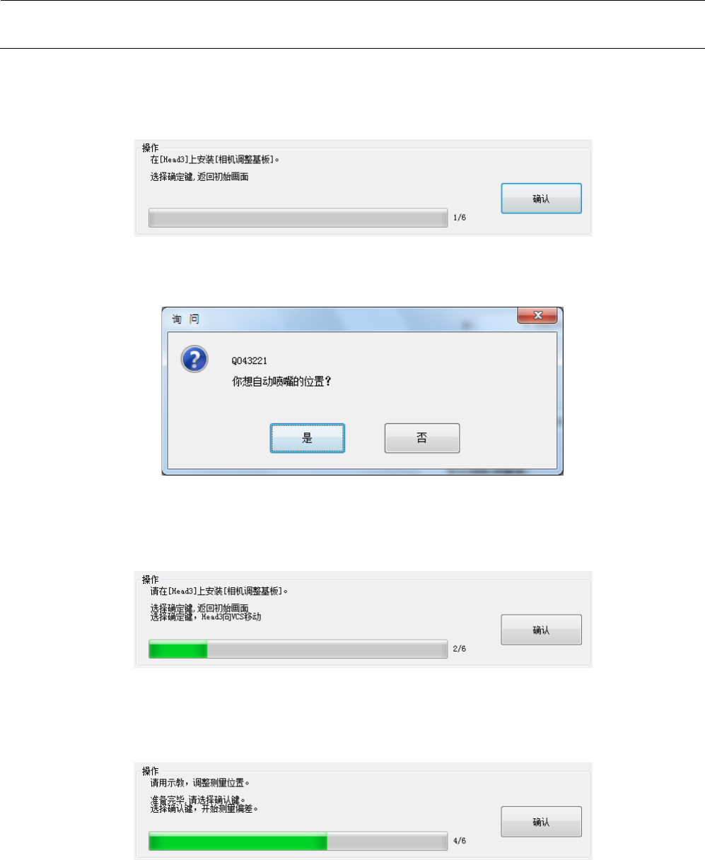 MS 参数 6- 10 建议打开护罩操作。 <操作 ・ 1/ 6 > 完成准备后,请选择 确认。 选择确认后,会出现 指示,要求将 7 50 8 号吸嘴安装在。 是:当 750 8 吸嘴已分配给 AT C 时,进行吸 嘴更换。 否: Head 移动到吸嘴 安装位置 。请用手 动 Head 3 上安装吸嘴。 <操作 ・ 2/6 > Head 移动到吸嘴安装 位置。请 用手动使 Head 3 吸取治具。 安装后选择“ OK ”, H ead…