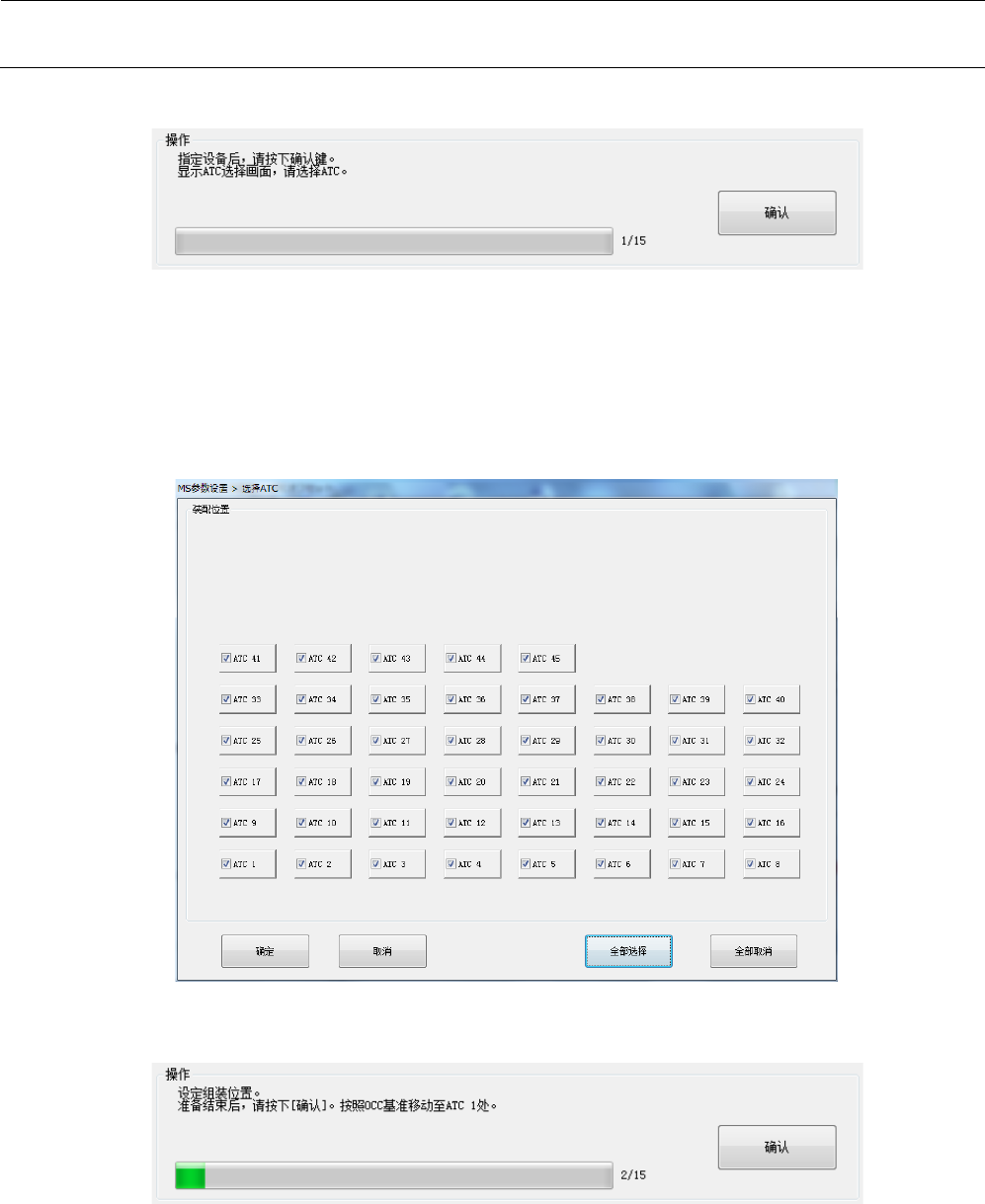 MS 参数 7-4 <操作 ・ 1/ 15 > 请从“自动计算” 、 “手动计测”中选择偏移量取得方 法。如选择“自动计算”时,仅取 得 AT C 1 和 AT C 1 5 偏移量, 而 AT C 2 ~ 14 、 AT C 1 6 ~ 45 以自动计算 算出。 如选择手动 计测时, 单独取得被指定的 AT C 编号的偏移量 。 请按下“操作”框内 的“确认”按钮。 选择“确认”后,将 显示“ AT C 选择”对话框 ,故请 选择想要取…