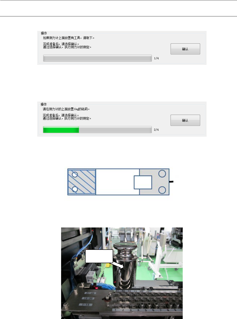 MS 参数 7- 24 <操作 ・ 1/ 4 > 请以简易控制等方式 使贴片头从测力计 上方退避, 确 认测力计上 不放有任 何东西, 选择 “确 认” 。 取得无载荷时测力计 的检测值。 <操作 ・ 2/4 > 请把 1kg 的砝码“基 准砝码 _1 kg ”放在测力传感器 上 ,选择确认 。 取得 1kg 载荷时测力 传感器的检测值。 下图是从前侧看到的 测力传感器的影像 图。请放在斜 线部的载荷检测位置 上。 请不要让砝码与右侧 …