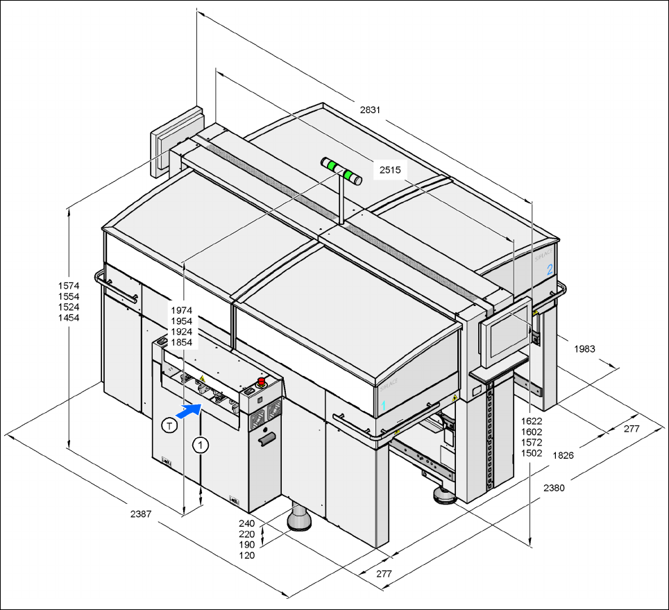 3 Dados técnicos Manual do usuário SIPLACE Série HF 3.4 Dimensões e peso das máquinas automáticas Versão de software SR. 50x.xx Edição 01/2006 PT 100 3.4.2 Dimensõe s da máquin a automát ica HF/3 3 3 3 3 Fig. 3.4 - 2 Dim…
