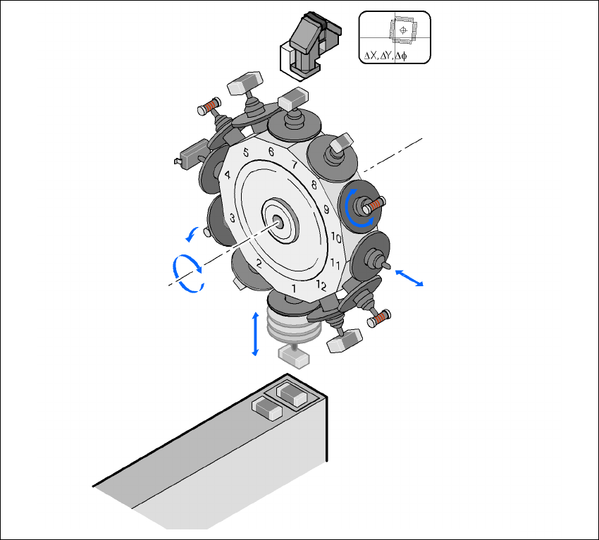 O eixo DP roda o componente centrado opticamente para a posição pretendida para a monta-