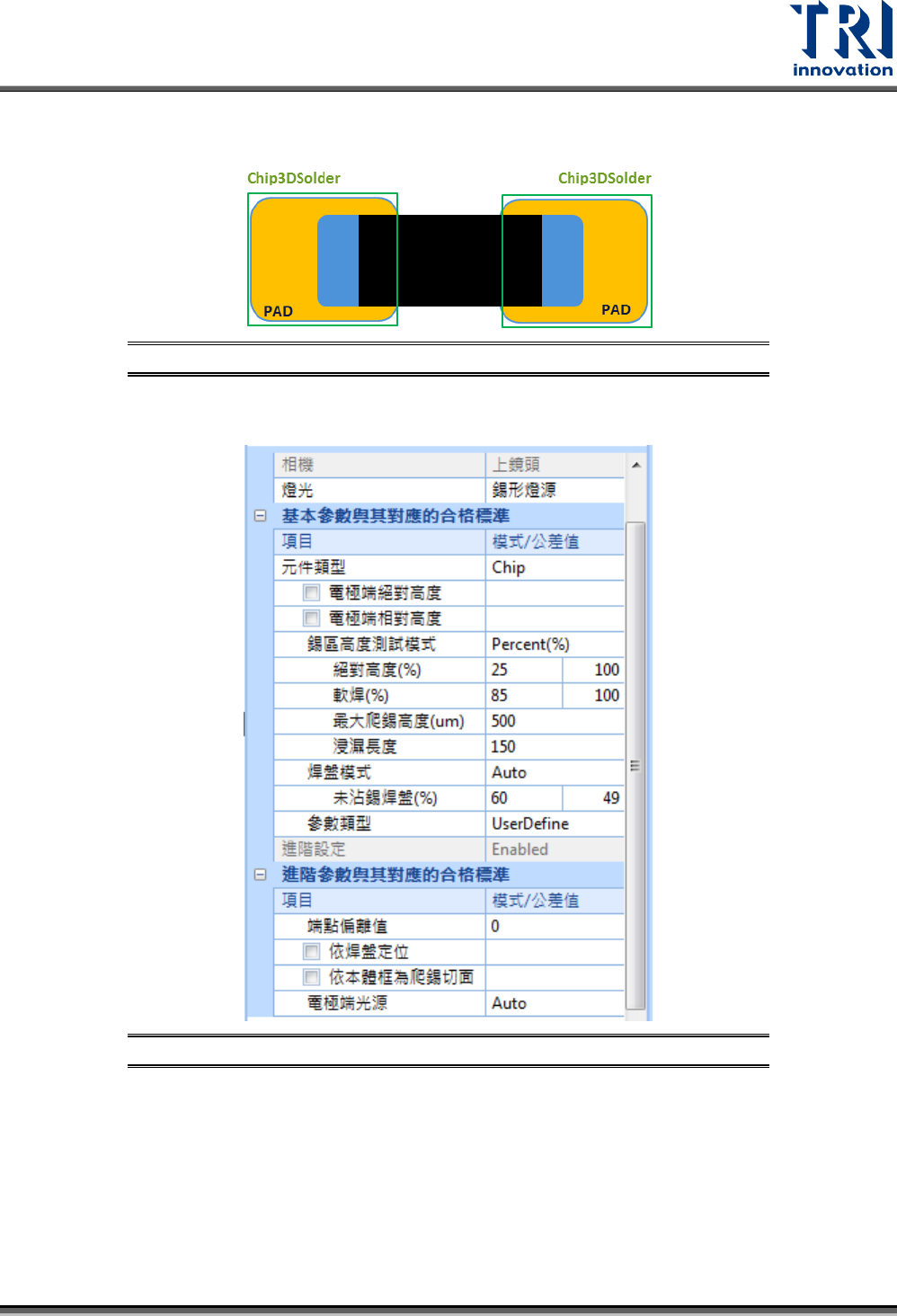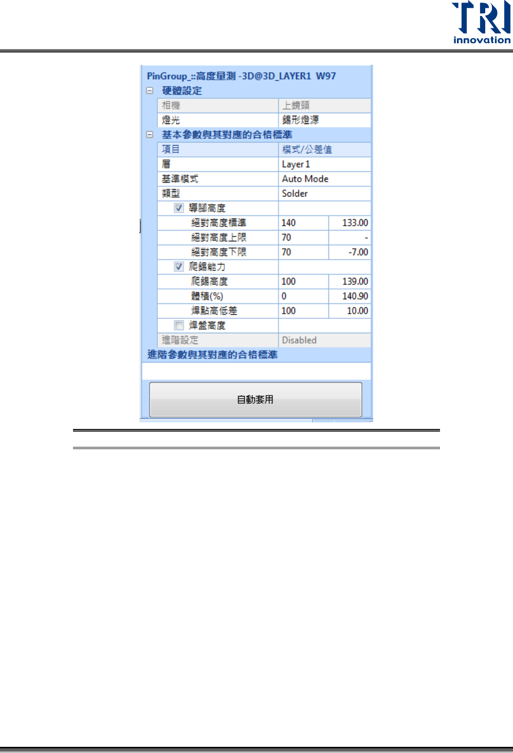 Test Research, Inc. TR7500Q E User Gu ide – S o f twar e 84 圖 132 : 3D 框 – Lay er 層 – Sold er 類型參數設定畫面 導腳高度 - 絕對高度標準:設定絕 對高度值。絕對高 度指的是導腳位置 至底板的預期高 度。 - 絕對高度上限:設定絕 對高度值的上限。 - 絕對高度下限:設定絕 對高度值的下限。 爬錫能力 - 高度:設定錫膏爬到元 件側壁所…