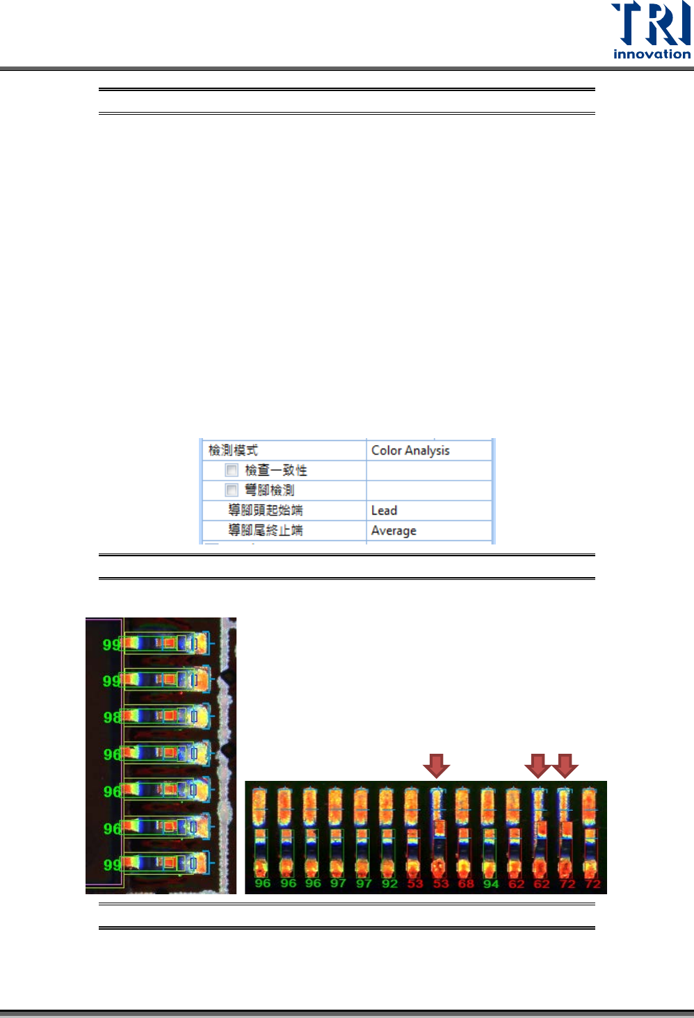 • 比率%:設定導腳頭起始端位置的選取顏色的寬度佔檢測框寬的比例,建議值