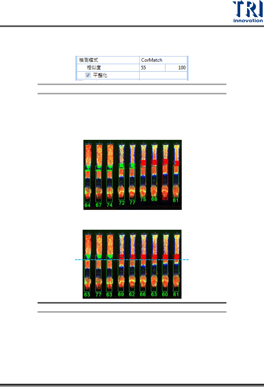 Test Research, Inc. TR7500Q E User Gu ide – S o f twar e 104 圖 17 0 : Lead 框導角尾終止 位置 – Averag e 搜尋方式 − Indiv idual :單獨計算導腳尾終止端位置 。適用於當導腳尾 端顏色完整 且需要 精確定位 的情況,如下圖所示。 圖 171 : Lead 框導角尾終止 位置 – Individual 搜 尋方式 − Fi xed :以固定檢…