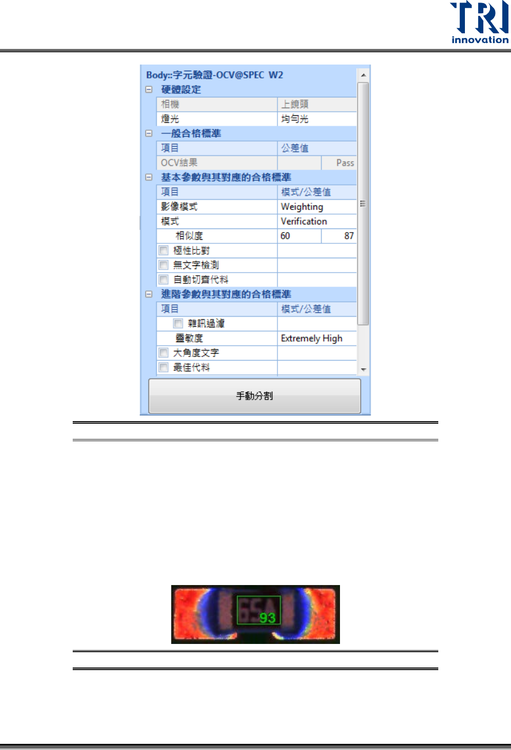 Test Research, Inc. TR7500Q E User Gu ide – S o f twar e 107 圖 177 : Lead 框進階功能 – 檢查三 角錫形 3.6.7 字元驗證 ( OCV ) 框 1) 用途:用來辨識 元件上的文字並進 行比對。 2) 檢測原理:利用 影像中字體的輪廓 特徵比對來計算 相似度。 3) 參數畫面與說明 : 空焊 正常 正常