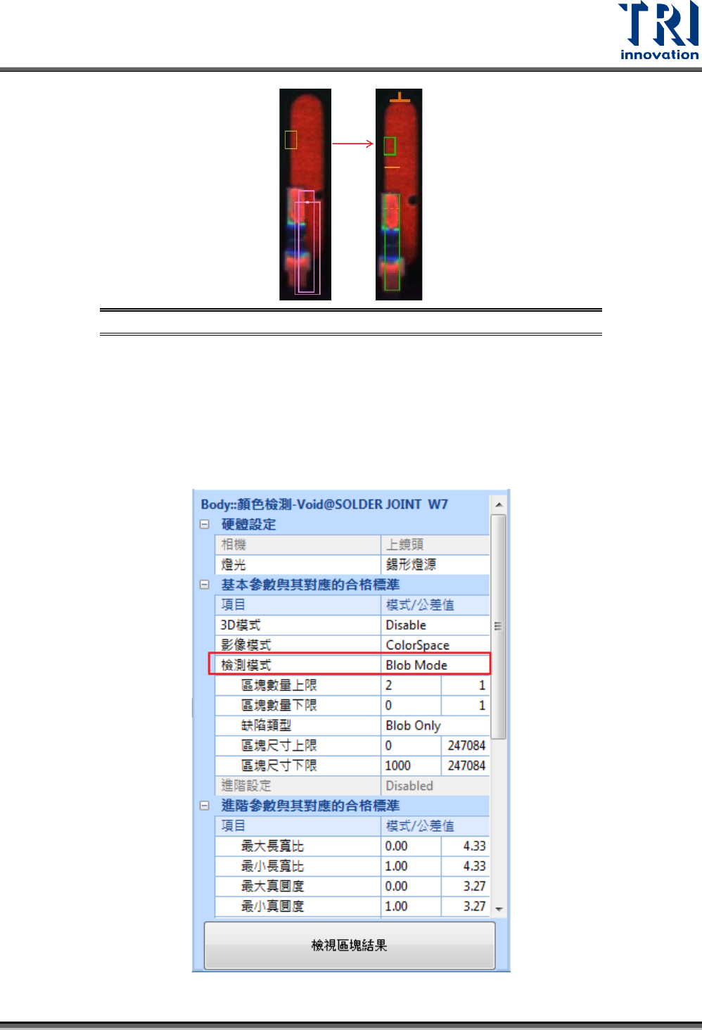 自動填補孔洞:檢測時會將所選色彩所包含範圍中的孔洞自動填補,以提升檢測能力。