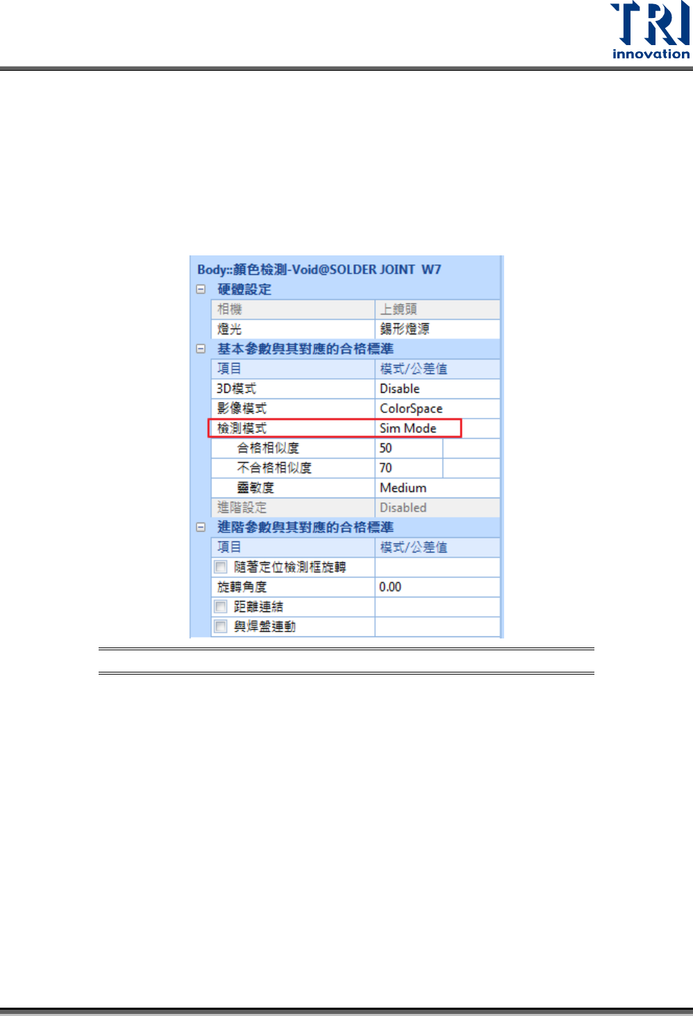 Test Research, Inc. TR7500Q E User Gu ide – S o f twar e 121 3.6.10. 3 Sim Mode 1) 用途:用於錫型燈下的 錫型分析 ,藉由加代料影像的方式教導專案好 壞錫型的色彩 / 外觀差異, 再計算出相似度來判斷 是否為瑕疵,來檢 查元件的錫點空焊 。 2) 檢測原理: 1. 灰階模式:計算所設 定的灰階找出的 影像是否與教導過的影 像相似。 2. 色彩模式:計算所設…