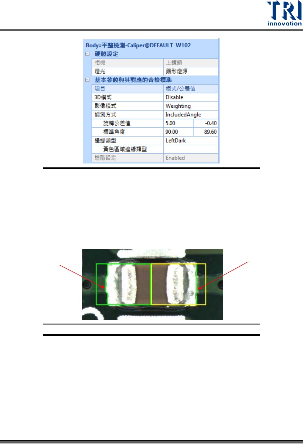 Test Research, Inc. TR7500Q E User Gu ide – S o f twar e 130 圖 211 :平 整檢測框 – 偵測方式 – IncludedAngle 範例設定 進階參數與其對應的合格 標準: 使用尾端比例 ( %) :忽略 檢測框中間線段部分 ( 凹凸而導致非直線 狀態 ) ,僅取設定 百分比的 位置進行計算。預設是 30 % ,表示檢測框前後端 30% 需計算直線,而中間 黃框的部…