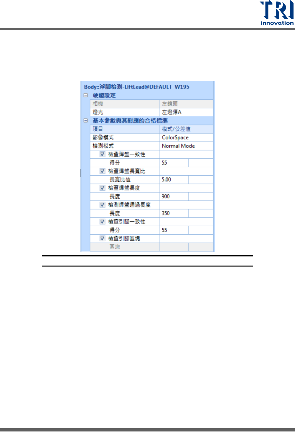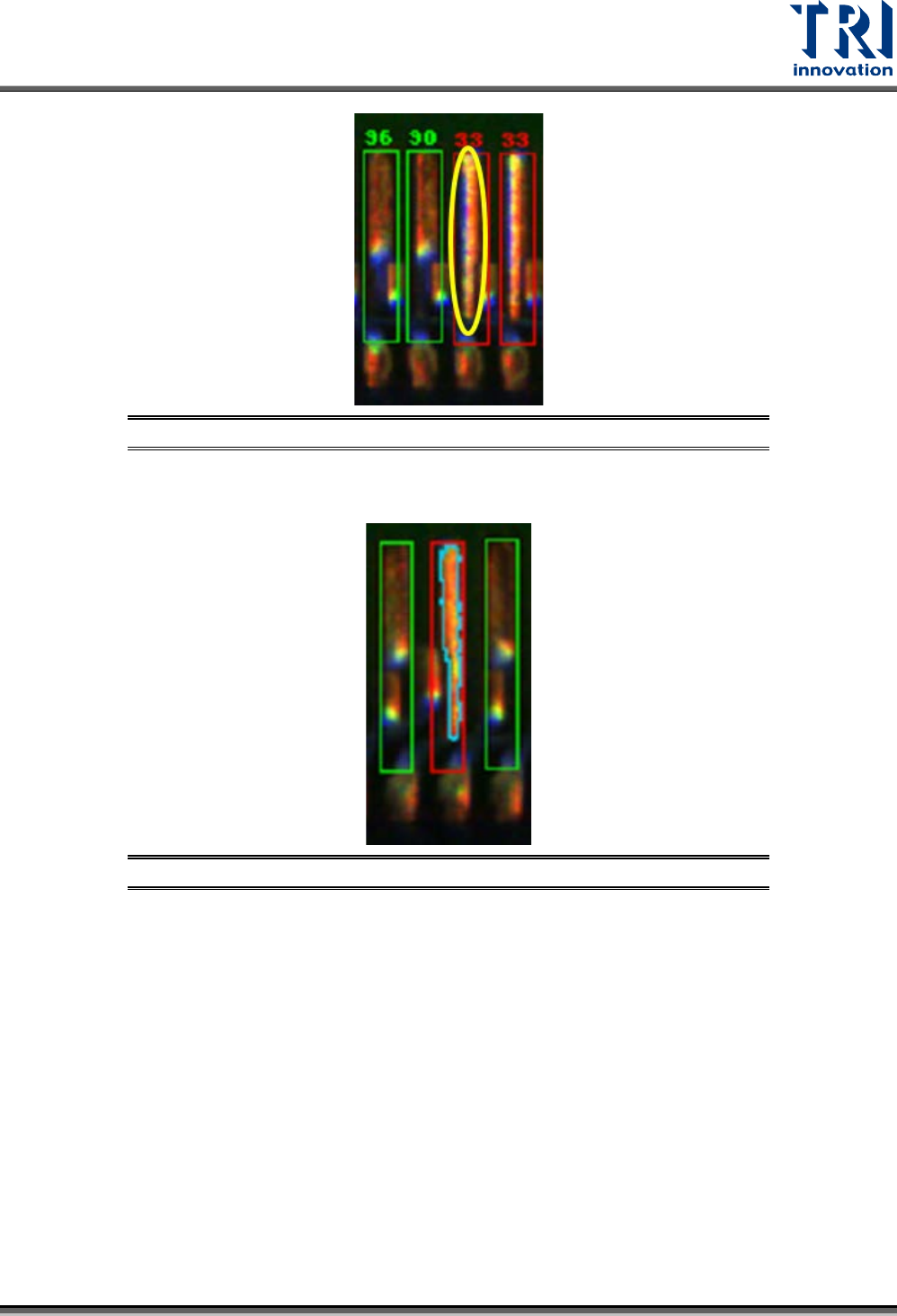 Test Research, Inc. TR7500Q E User Gu ide – S o f twar e 148 圖 240 :檢 查焊盤一致 性範例 檢查焊盤長寬比:進行 焊盤的長寬比例計 算,若長度過長寬 比值過大的會以 區塊的方式標 出缺陷。如下圖所示, 中間的引腳為有空 焊缺陷的引腳。 圖 241 :檢 查焊盤長寬 比範例 檢查焊盤長度:檢查焊 盤的整體長度。一 般來說空焊時,其 焊盤區塊的整體 長度會較長。 如…