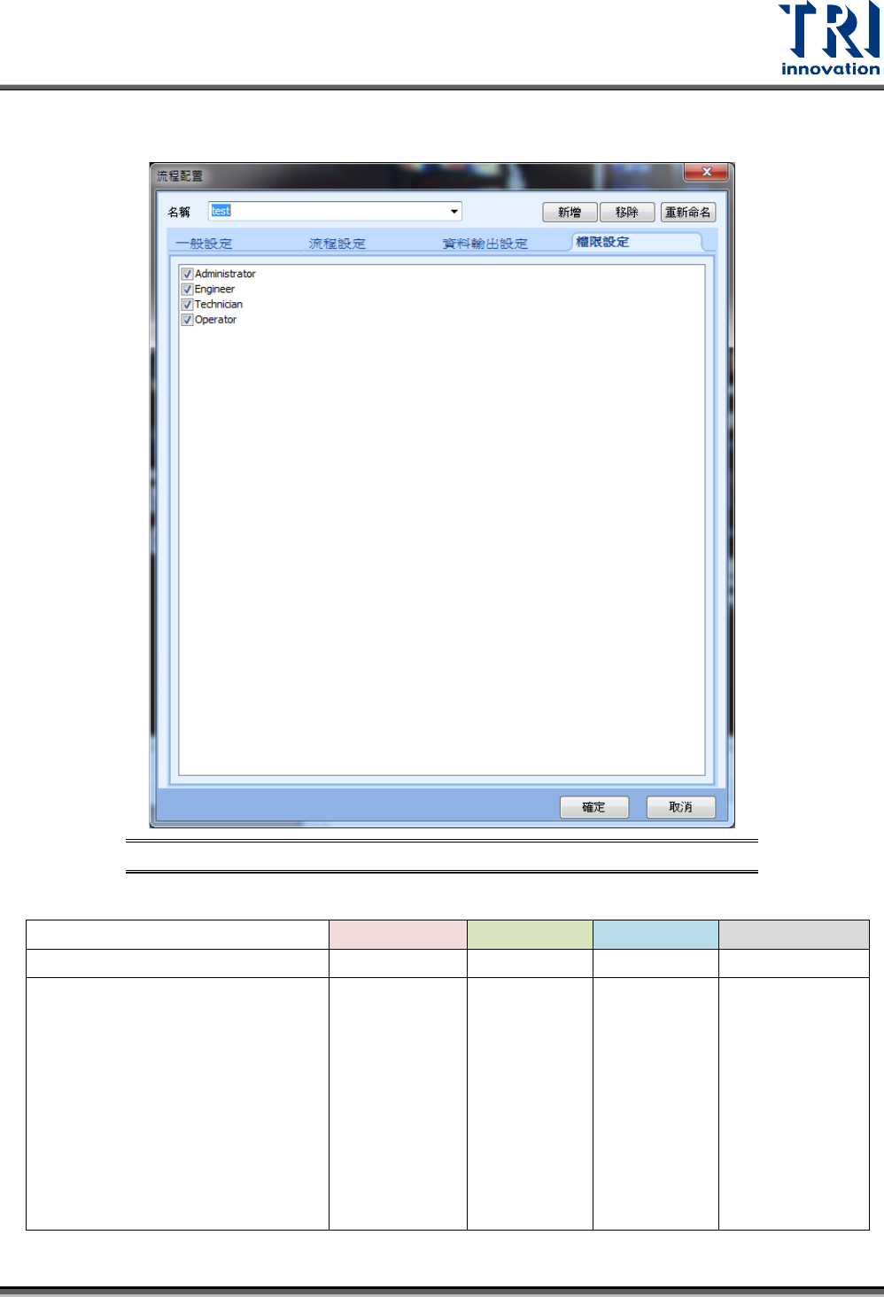 Test Research, Inc. TR7500Q E User Gu ide – S o f twar e 187 區分為四種權限, A dministr ator 、 E ngineer 、 Technician 、 Operator ,如下 圖所示。 在這邊可以設定所選擇 的流程配置可供哪 個權限的使用者 使用。 圖 288 :流 程架構設定 視窗 – 權限設定 不同的權限所能使用的 功能如下表所示。 使用者 ID Opera…